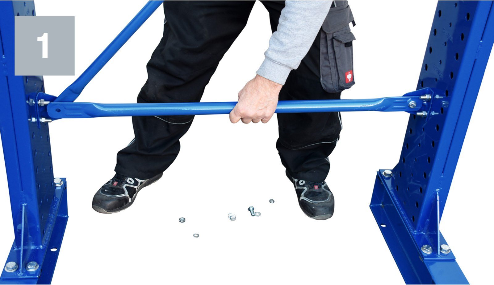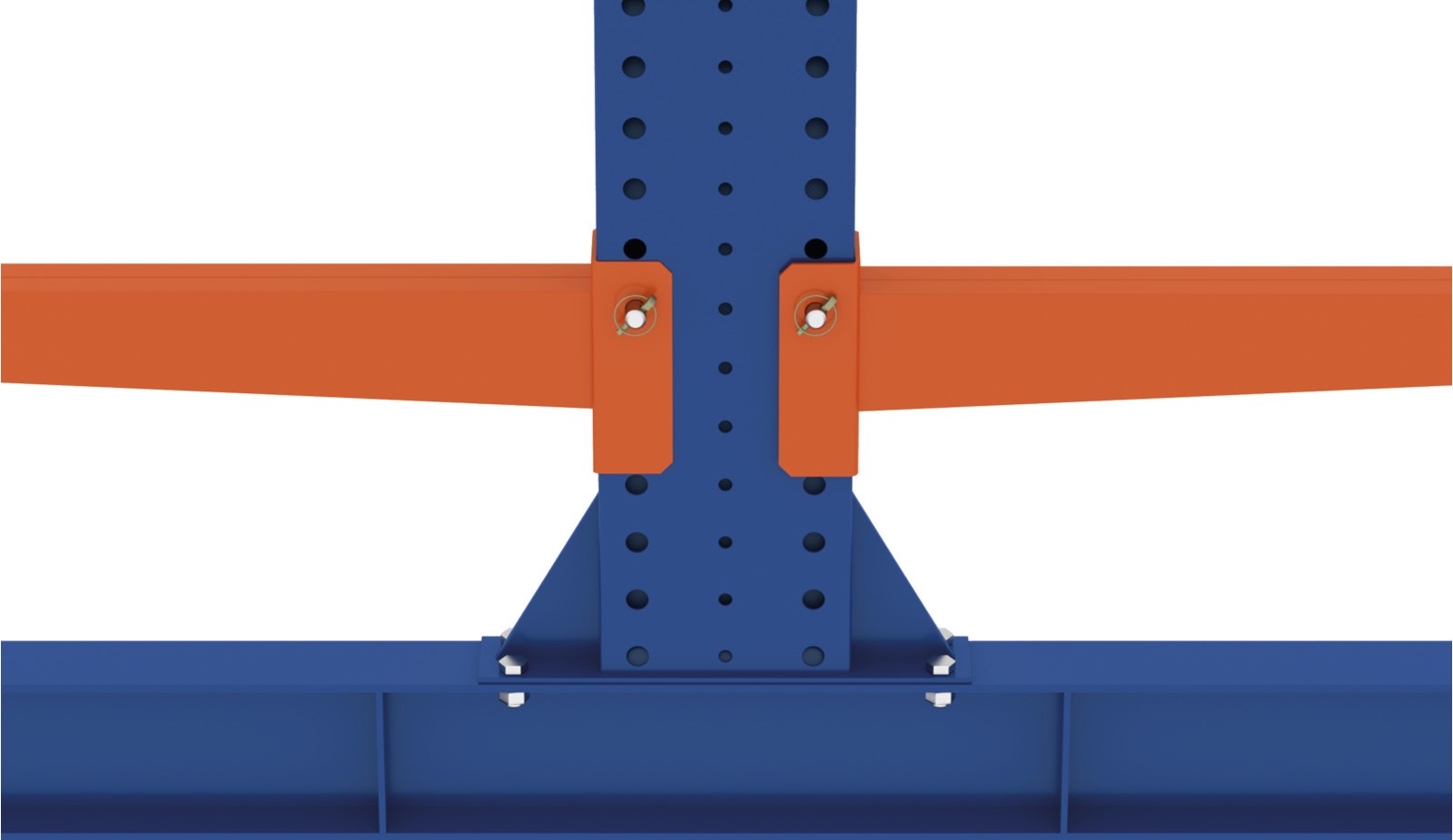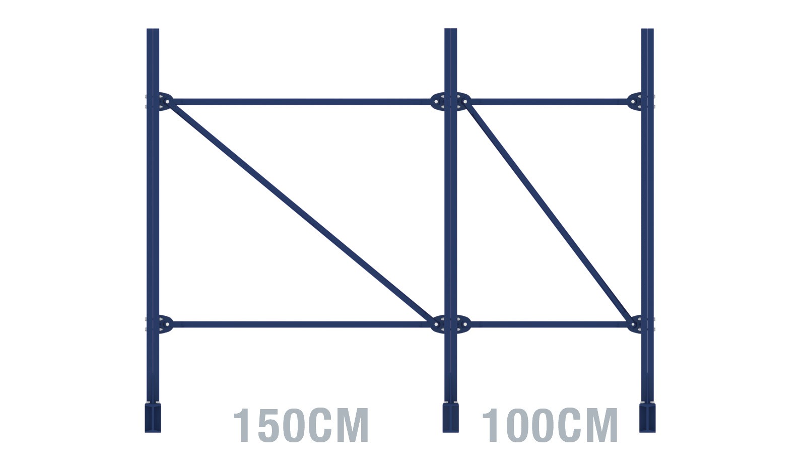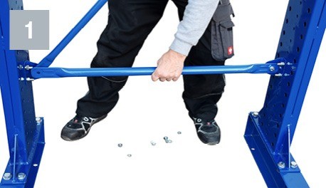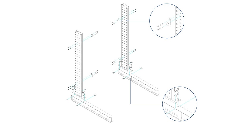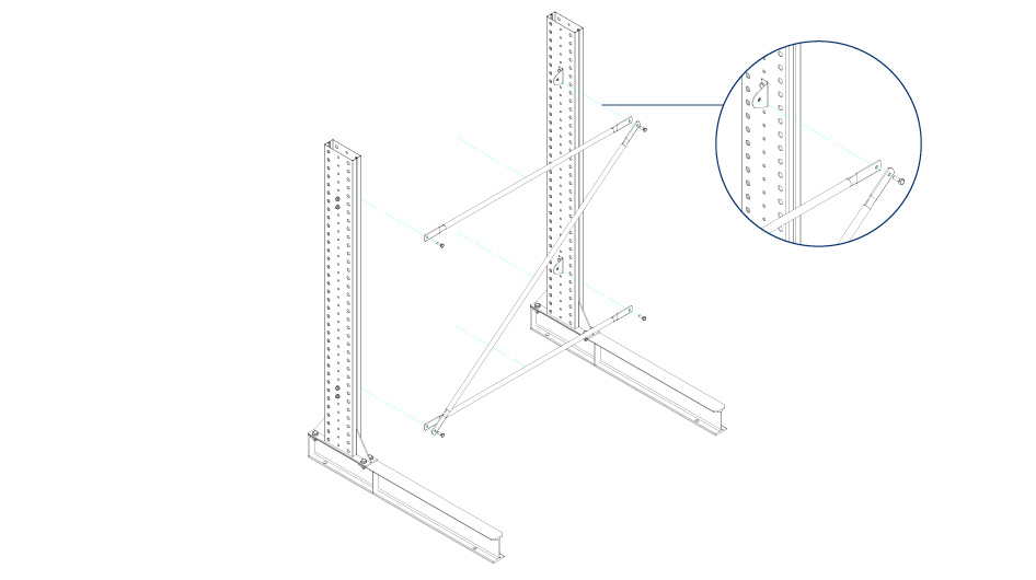 - The assembly of the cross and diagonal braces is done by means of M10*80 hexagonal bolts, M10 washers, M10 nuts and retaining plates directly on the upright profile