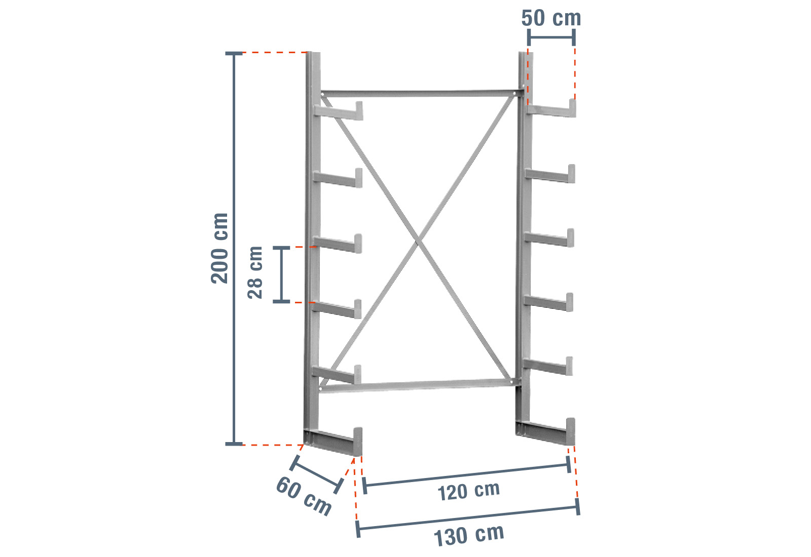This extra-robust cantilever rack with a width of 1,3 m is 2 m high and has 5 levels with a cantilever depth of 50 cm. Thanks to the single-sided design with welded-on cantilever arms, you can load each upright with a maximum of 1.250 kg, where each cantilever has a maximum load of 250 kg.