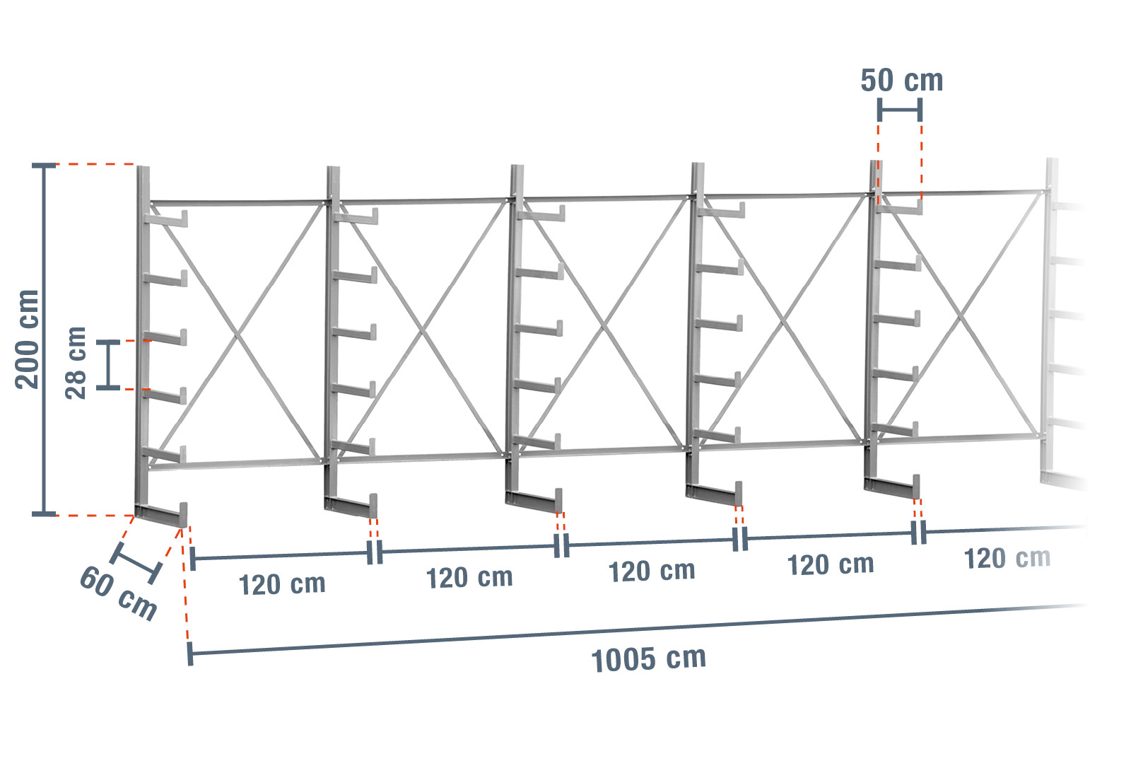 This extra-robust cantilever rack with a width of 10,05 m is 2 m high and has 5 levels with a cantilever depth of 50 cm. Thanks to the single-sided design with welded-on cantilever arms, you can load each upright with a maximum of 1.250 kg, where each cantilever has a maximum load of 250 kg.