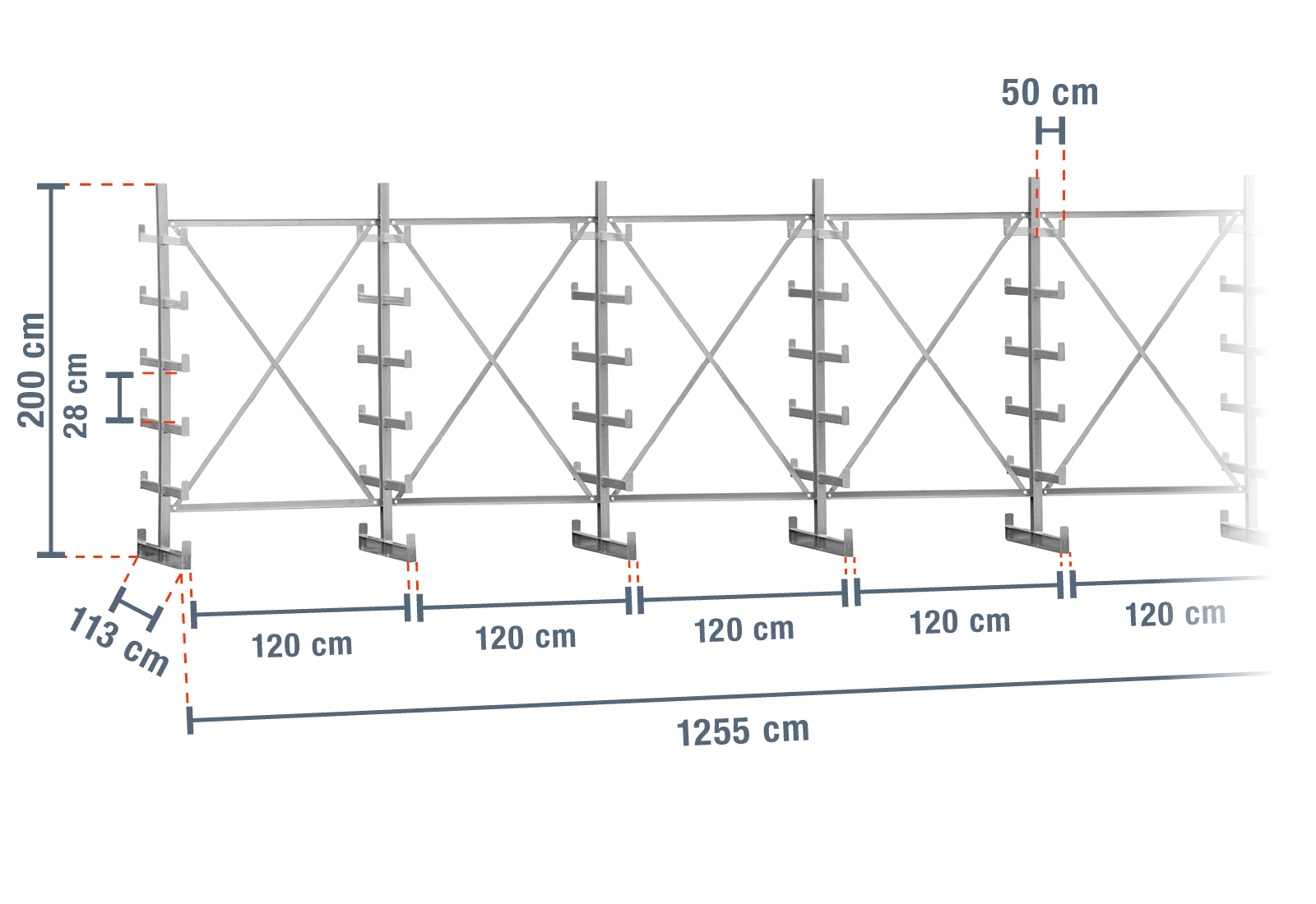 The individual uprights are bolted together using 2 cross and diagonal braces (centre-to-centre distance 1.200 mm). Each cantilever arm has a support width of 30 mm and is equipped with a 50 mm high roll-off guard. The 50 cm long base has a support depth of 50 cm, a support width of 50 mm and a 70 mm high roll-off guard. This means that the bases can also be used as storage levels.