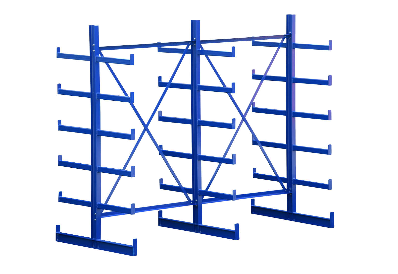 This extra-robust cantilever rack with a width of 2,55 m is 2 m high and has 5 levels with a cantilever depth of 50 cm. Thanks to the double-sided design with welded-on cantilever arms, you can load each upright with a maximum of 2.500 kg, where each cantilever has a maximum load of 250 kg.