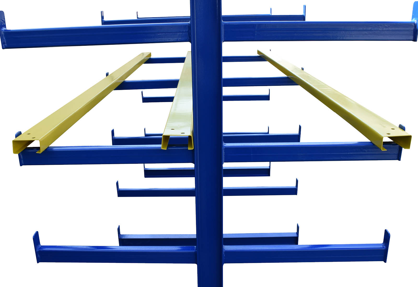 The 50 cm deep cantilevers in the signal colour of blue are ideal for the storage of long goods.