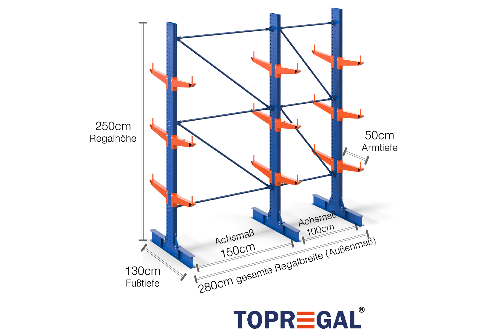 The axial dimension is the internal dimension between two shelf uprights. Depending on the cantilever type, we offer these fields in 120 cm (KR2500) and in 100 cm / 150 cm (KR3000 / KR6000).