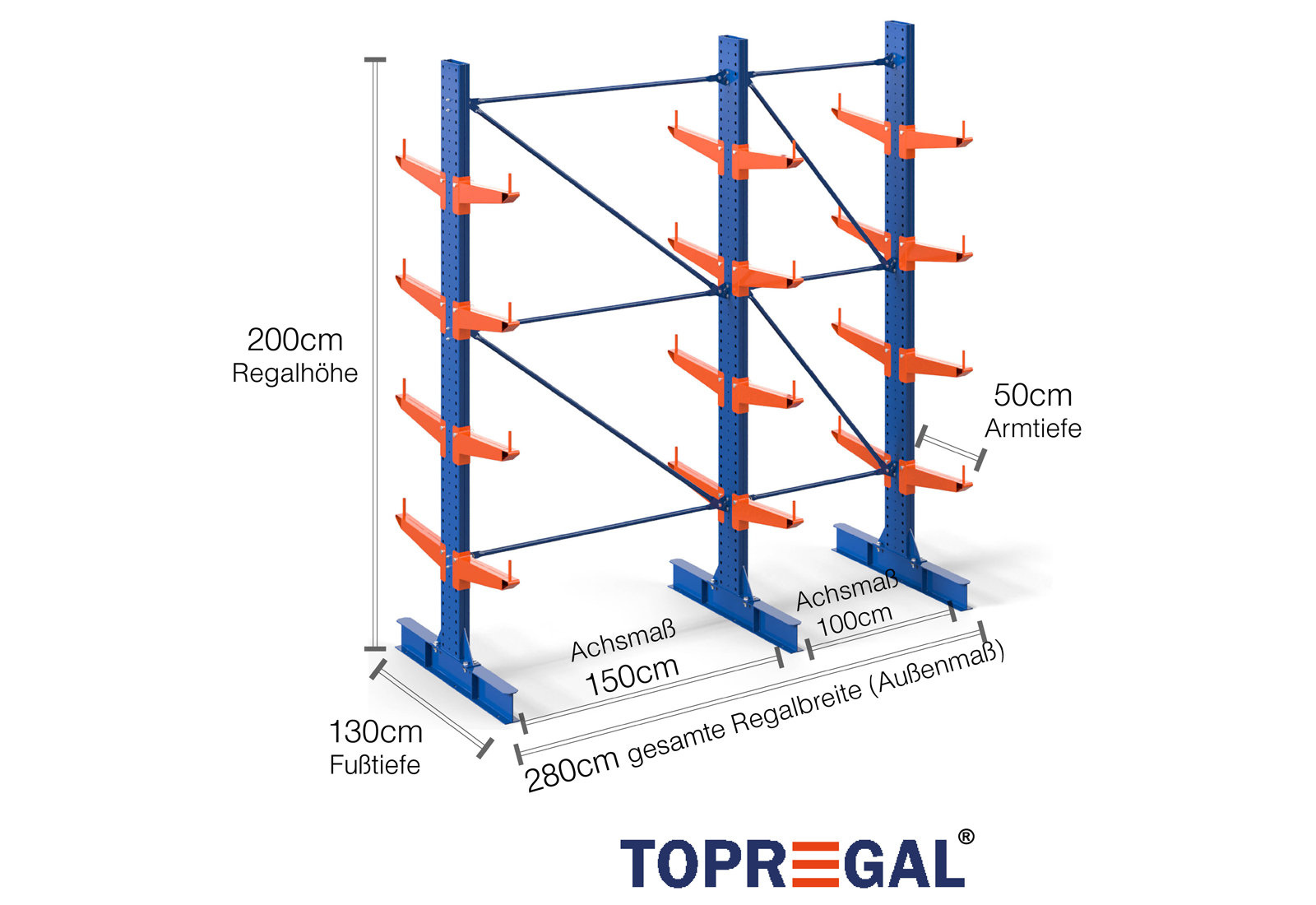 The axial dimension is the internal dimension between two shelf uprights. Depending on the cantilever type, we offer these fields in 120 cm (KR2500) and in 100 cm / 150 cm (KR3000 / KR6000).