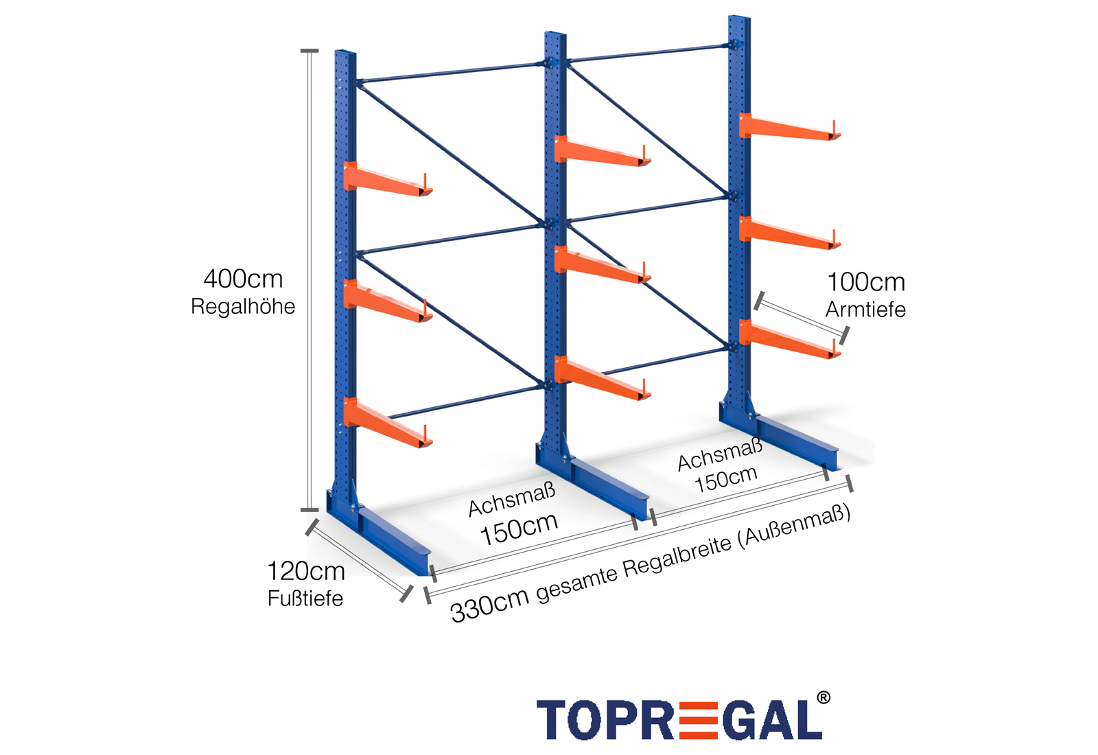 The axial dimension is the internal dimension between two shelf uprights. Depending on the cantilever type, we offer these fields in 120 cm (KR2500) and in 100 cm / 150 cm (KR3000 / KR6000).