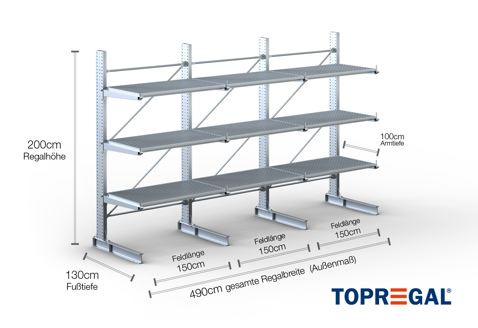 The axial dimension is the internal dimension between two shelf uprights. Depending on the cantilever type, we offer these fields in 120 cm (KR2500) and in 100 cm / 150 cm (KR3000 / KR6000).