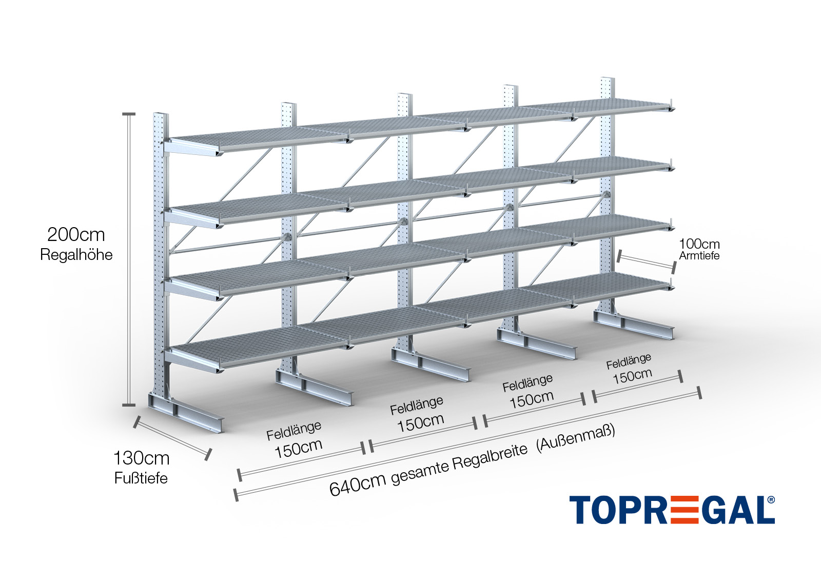 6,4 m cantilever rack KR3000 / Hot-dip galvanised / One-sided / 2 m high / 100 cm cantilever depth / 4 levels / rack layer Galvanised mesh