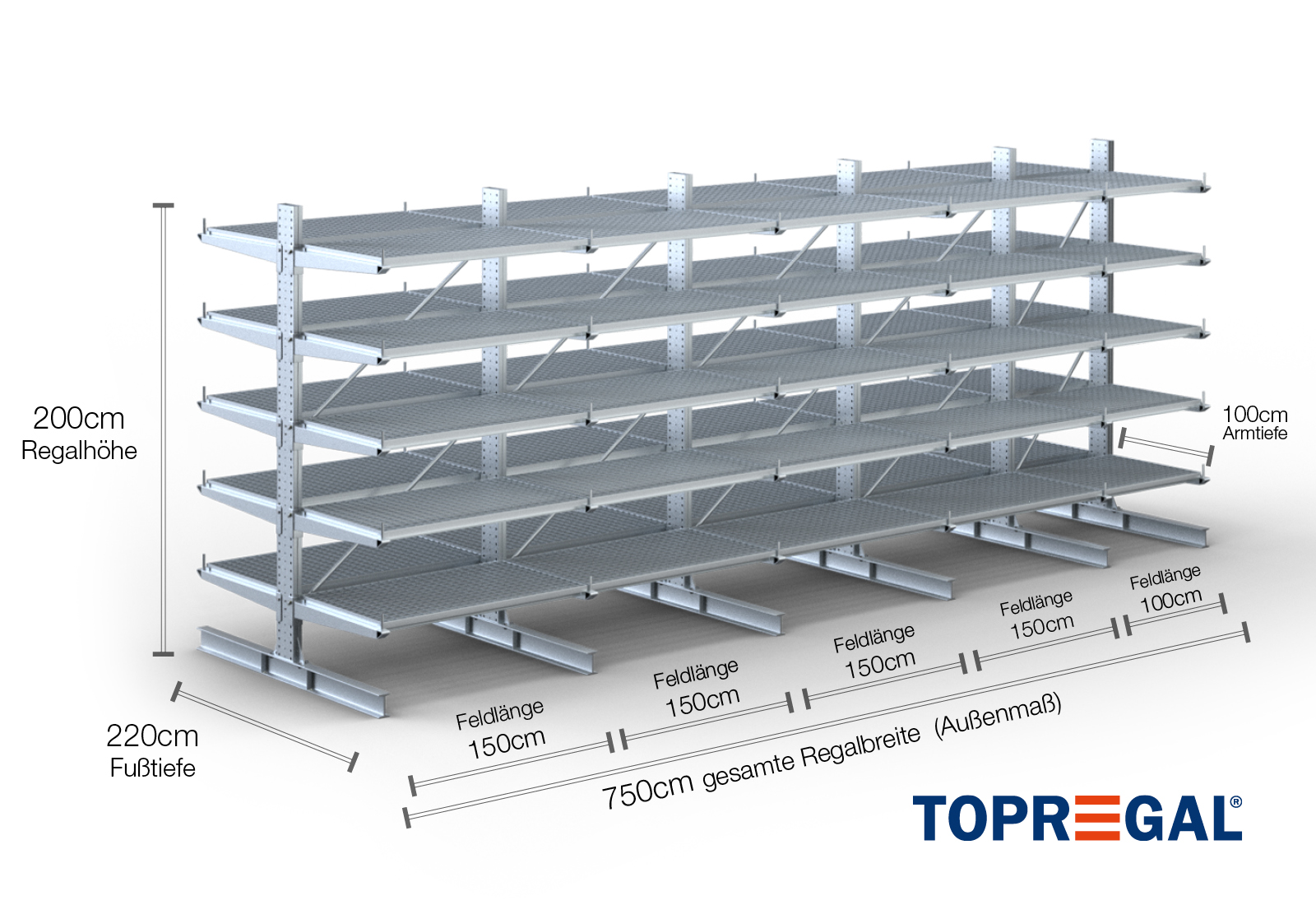 7,5 m cantilever rack KR3000 / Hot-dip galvanised / Double-sided / 2 m high / 100 cm cantilever depth / 5 levels / rack layer Galvanised mesh