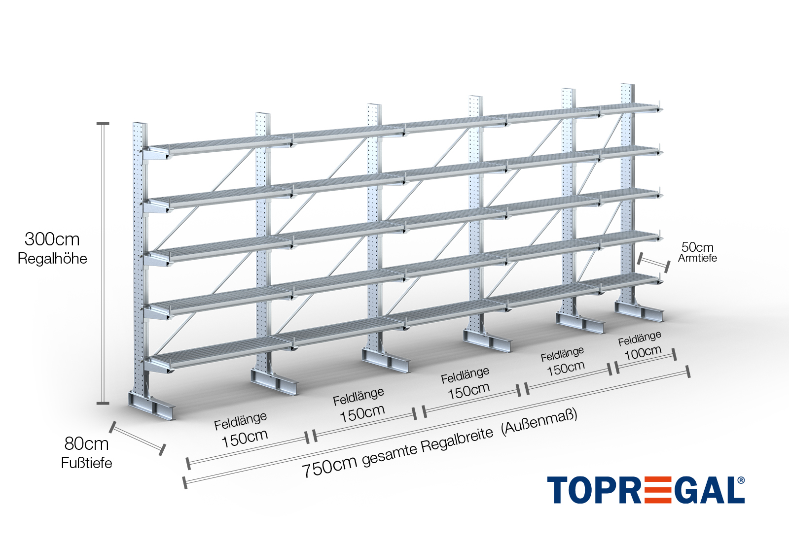7,5 m cantilever rack KR3000 / Hot-dip galvanised / One-sided / 3 m high / 50 cm cantilever depth / 5 levels / rack layer Galvanised mesh