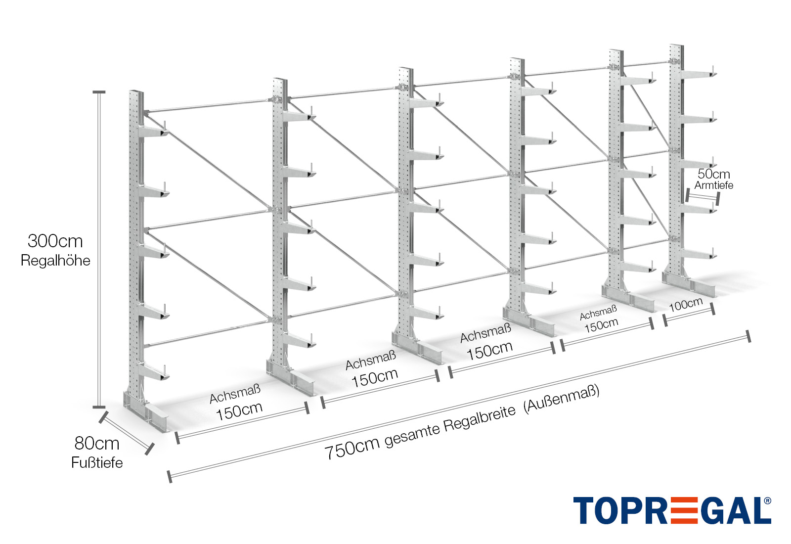The axial dimension is the internal dimension between two shelf uprights. Depending on the cantilever type, we offer these fields in 120 cm (KR2500) and in 100 cm / 150 cm (KR3000 / KR6000).