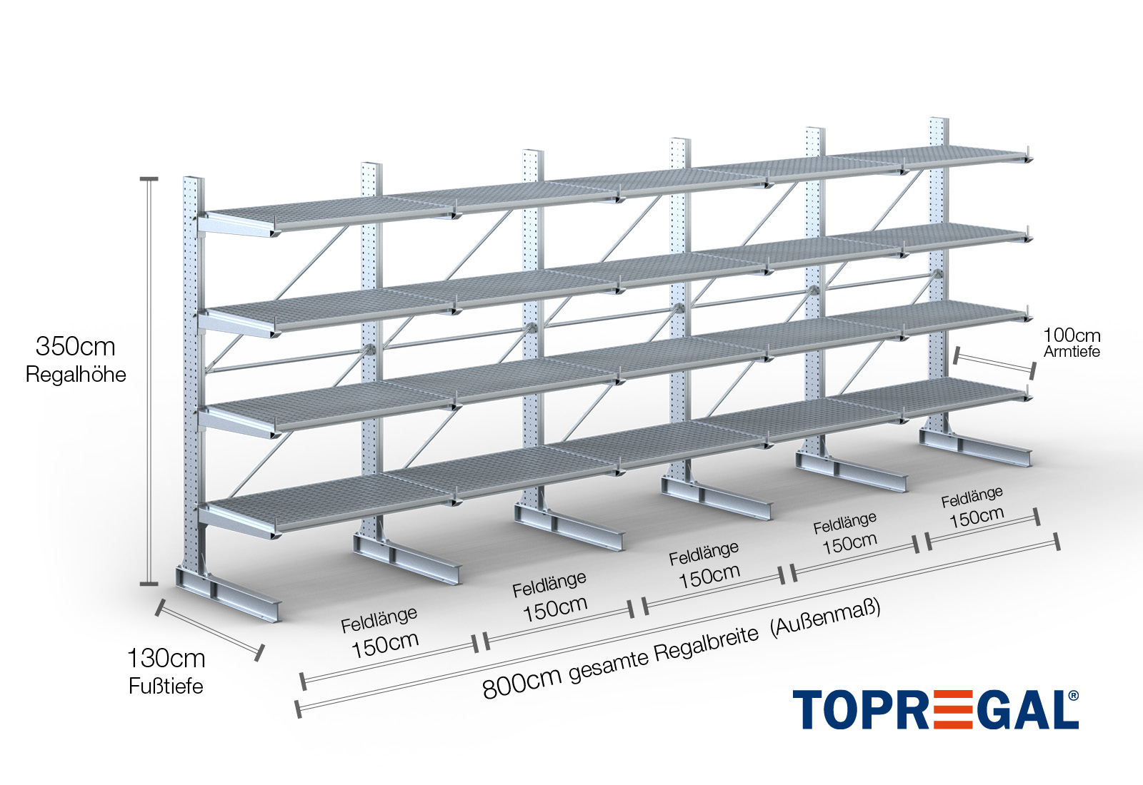 The axial dimension is the internal dimension between two shelf uprights. Depending on the cantilever type, we offer these fields in 120 cm (KR2500) and in 100 cm / 150 cm (KR3000 / KR6000).
