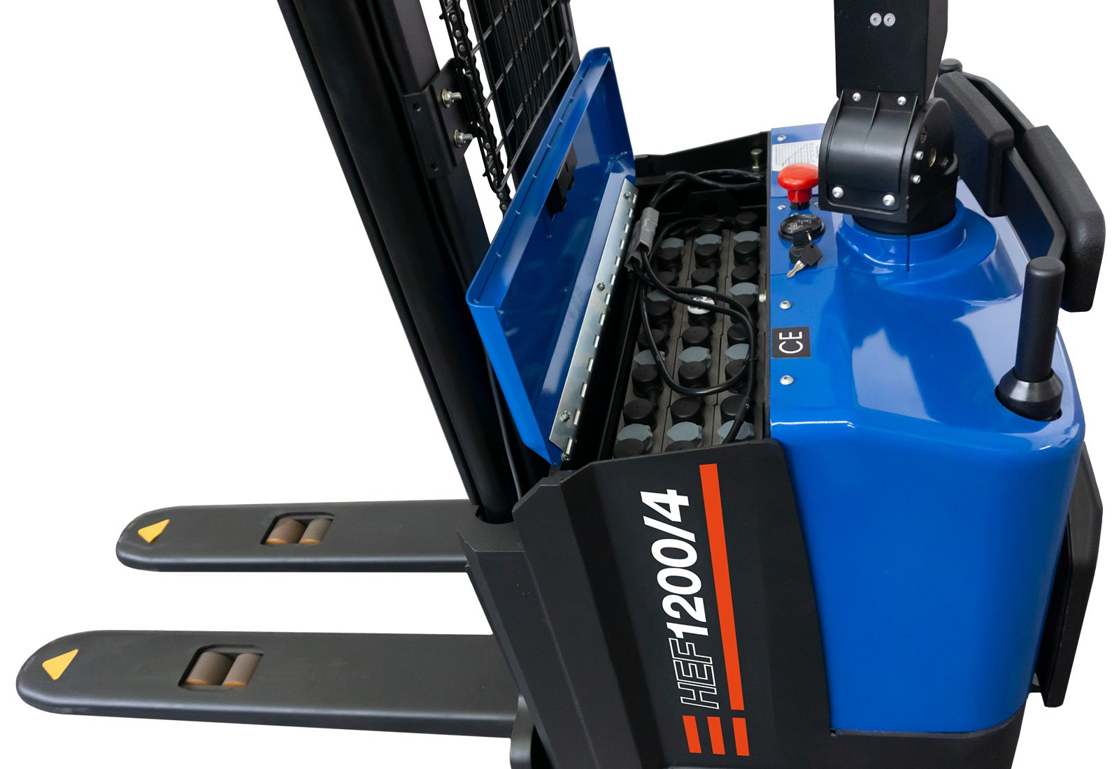 Thanks to the waterproof control unit, the high quality electronic high lift truck is perfectly suited to the demands of harsh working conditions such as cold, humidity and dust and is ideally suited for use in e.g. cold stores (for a limited time depending on the temperature) and production halls. The HEF1200/4 is not designed for permanent use in cold stores and in rain / humidity.