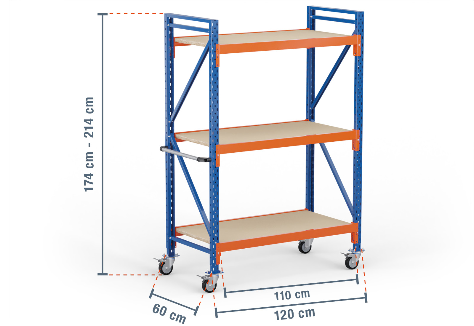 1,2 m mobile storage rack LR2000 / 60 cm deep / 1.740 - 2.140 mm high / 3 levels / rack layer Wood