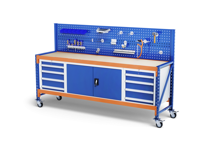 This already starts with the dimensions. It is available in two widths (120 cm and 230 cm) and depths (60 cm and 80 cm). The working height varies, depending on whether with or without optional rollers, between 75 centimeters and 129 centimeters. As equipment, shelves, lockable drawers or steel cabinets can be used as desired as well as seamlessly. With a load capacity of 500 kilograms per shelf, the shelves are extremely robust, even when loaded with extremely heavy products or tools. The work top can also be configured depending on the area of application. "Those who want to work with tools use the multiplex board made of robust beech wood sealed with linseed oil varnish as a support or take the inexpensive variant made of 25-millimeter-thick glued plywood. For work with liquids, we offer a steel plate or a practical, easy-to-clean grid. The perforated back panel, for which there are preconfigured accessory sets, provides order for tools," says Jürgen Effner.