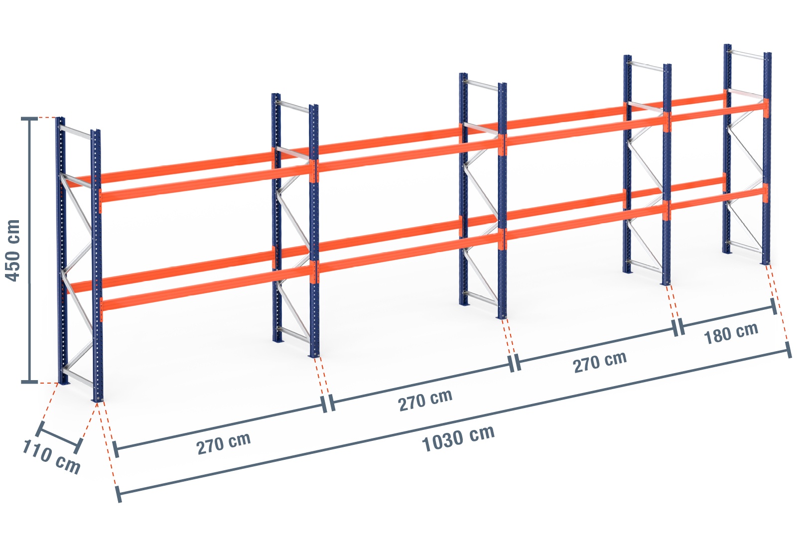 10,3 m pallet rack PR9000 / 110 cm deep / 4,5 m high / 2 levels for 33 euro pallets