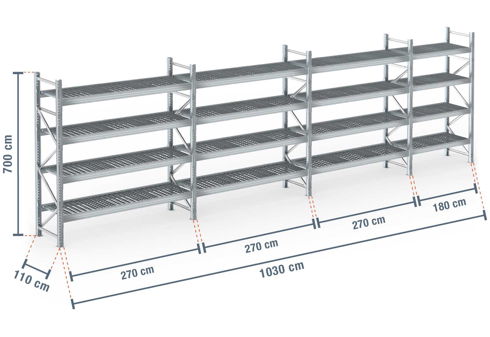 10,3 m pallet rack PR9000F galvanised / 110 cm deep / 7 m high / 4 levels / rack layer Galvanised mesh