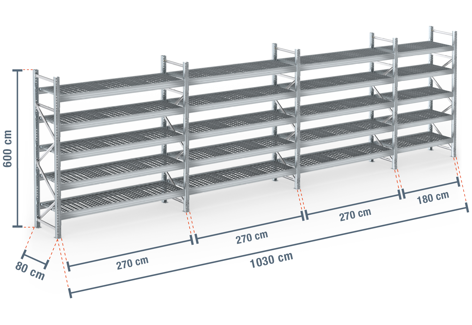 10,3 m pallet rack PR9000F galvanised / 80 cm deep / 6 m high / 5 levels / rack layer Galvanised mesh