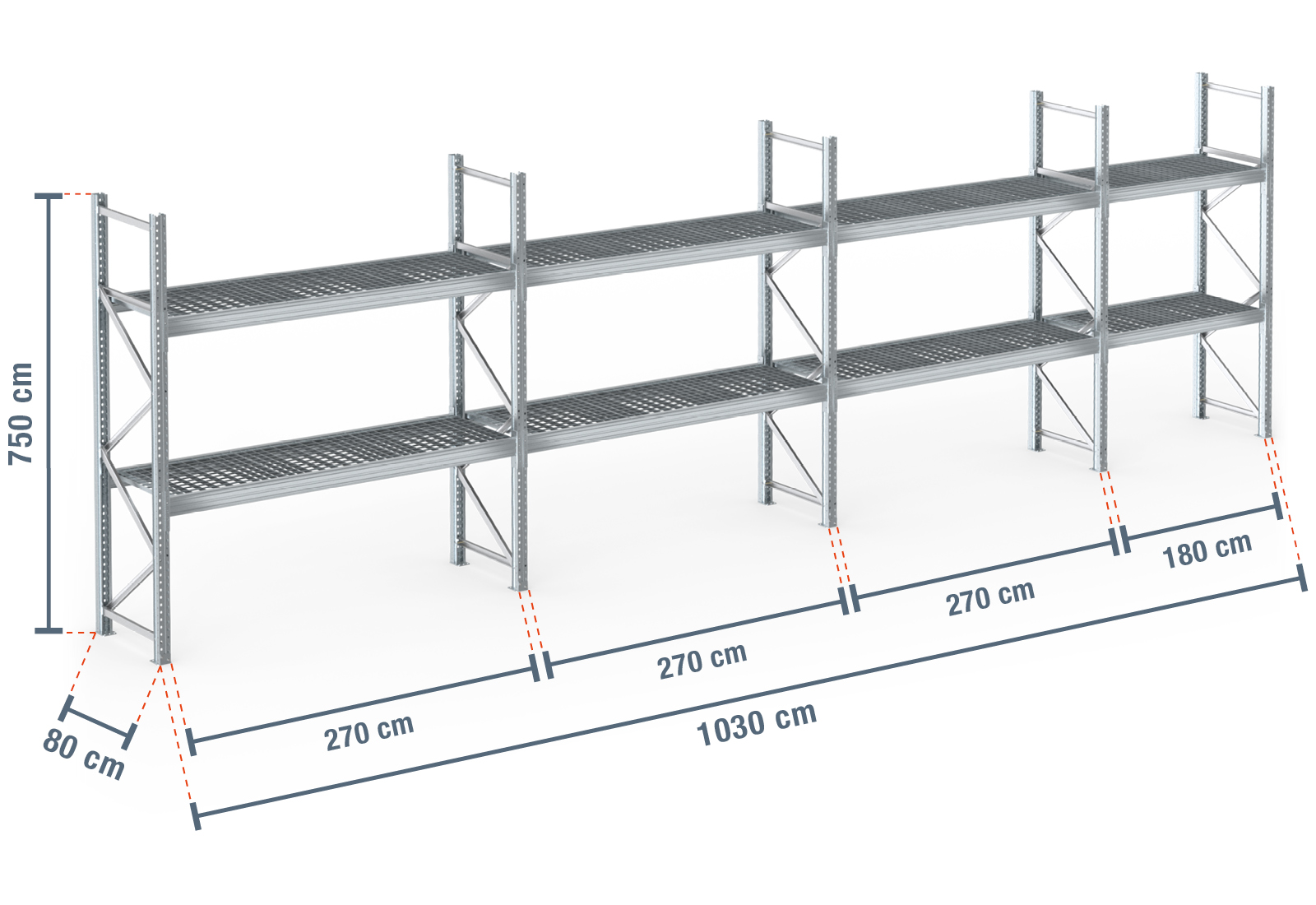 10,3 m pallet rack PR9000F galvanised / 80 cm deep / 7,5 m high / 2 levels / rack layer Galvanised mesh