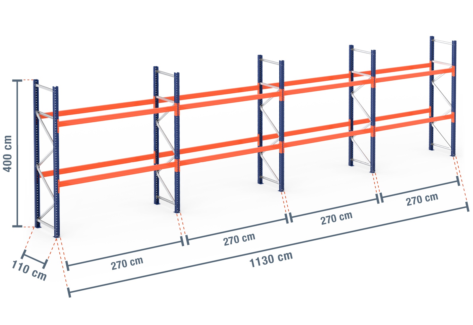 11,3 m pallet rack PR9000 / 110 cm deep / 4 m high / 2 levels for 36 euro pallets