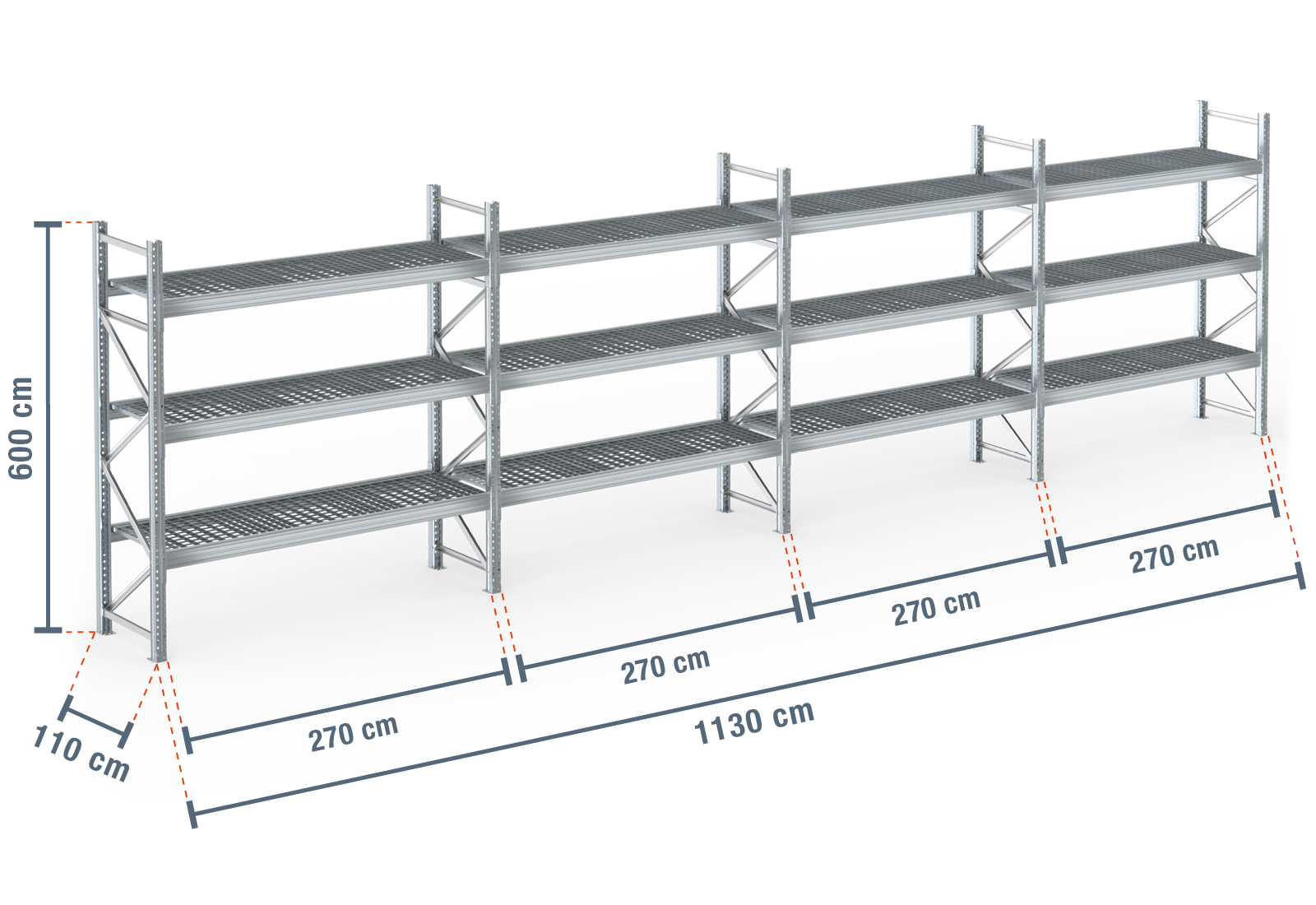 11,3 m pallet rack PR9000F galvanised / 110 cm deep / 6 m high / 3 levels / rack layer Galvanised mesh