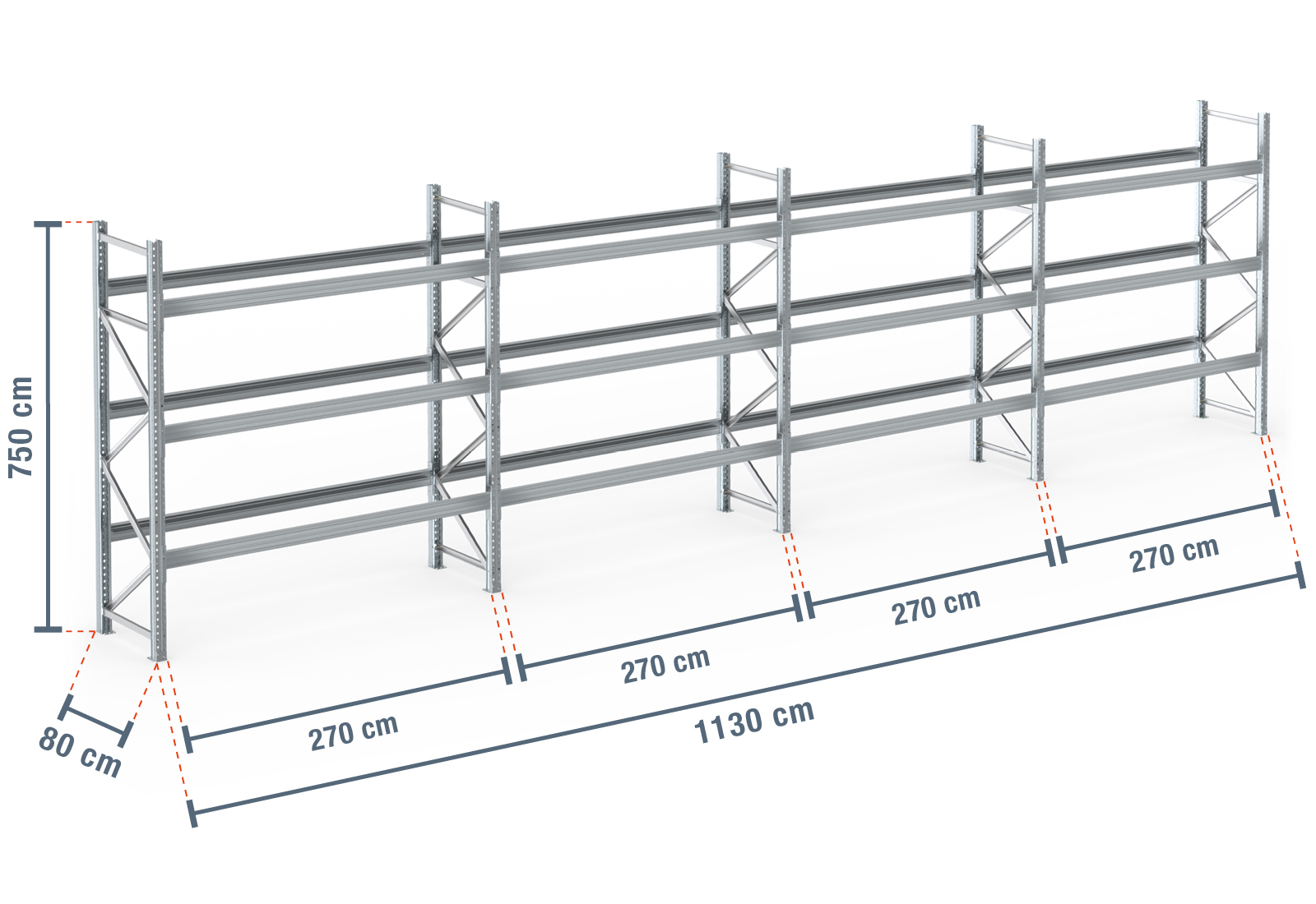 11,3 m pallet rack PR9000F galvanised / 80 cm deep / 7,5 m high / 3 levels for 48 euro pallets
