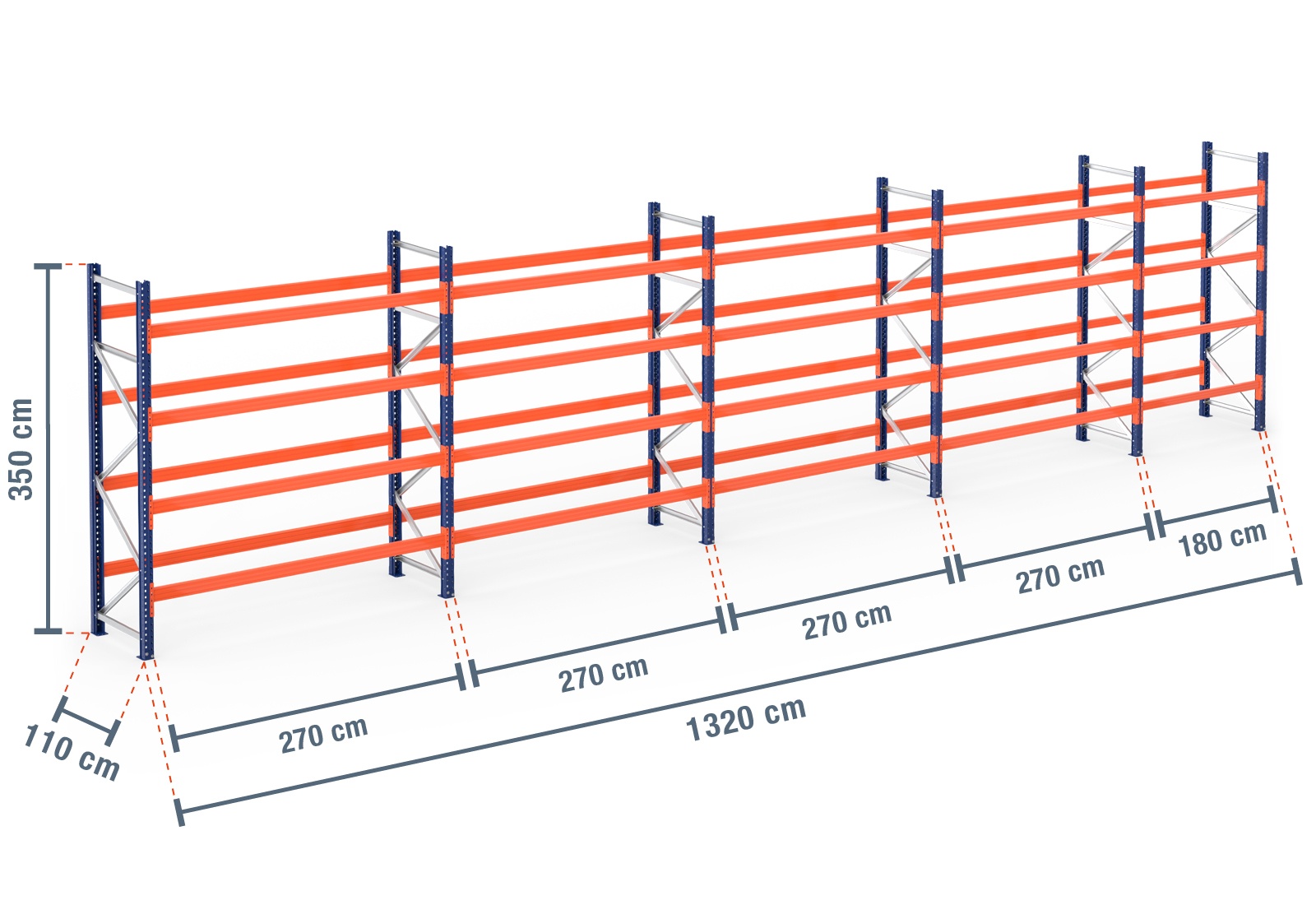 13,2 m pallet rack PR9000 / 110 cm deep / 3,5 m high / 4 levels for 70 euro pallets