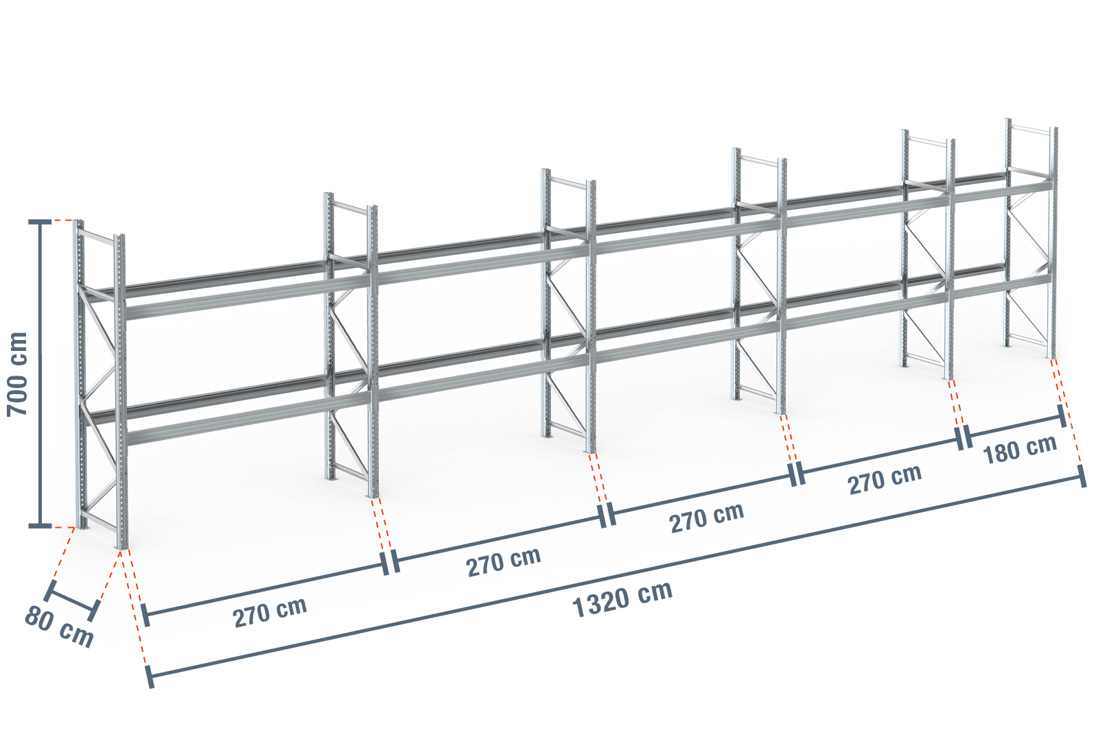 13,2 m pallet rack PR9000F galvanised / 80 cm deep / 7 m high / 2 levels for 42 euro pallets