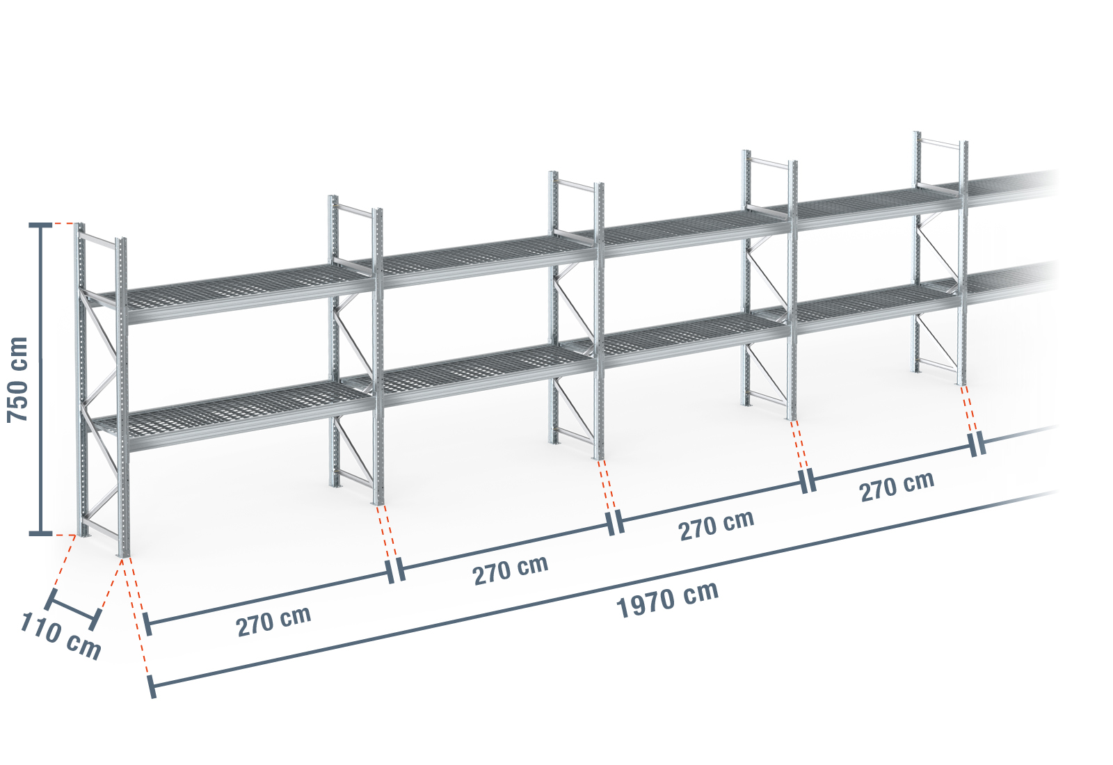 19,7 m pallet rack PR9000F galvanised / 110 cm deep / 7,5 m high / 2 levels / rack layer Galvanised mesh
