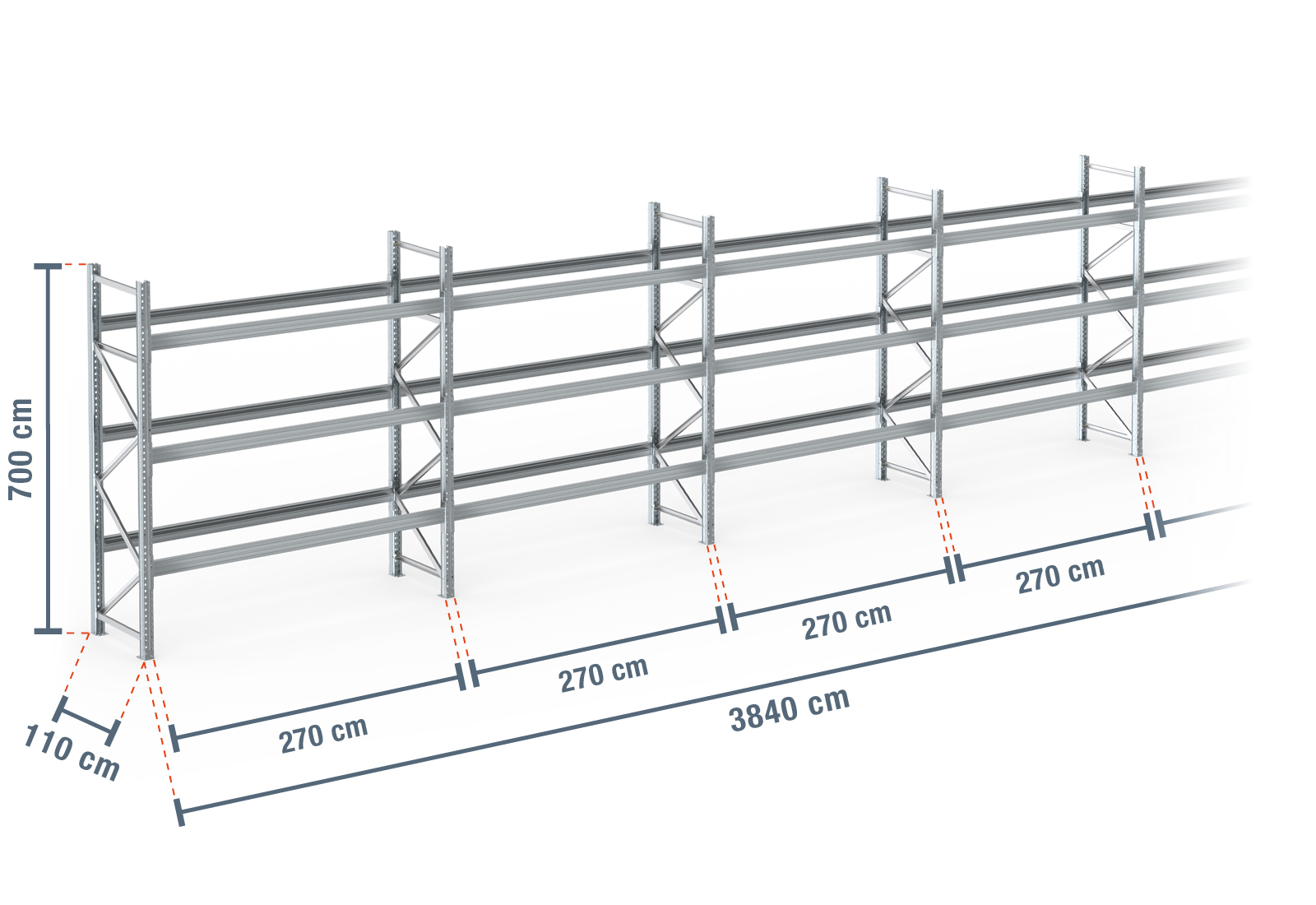 - 15 x upright PR9000F 7 m high / 110 cm deep incl. strutting, unit load capacity: 9.000 kg