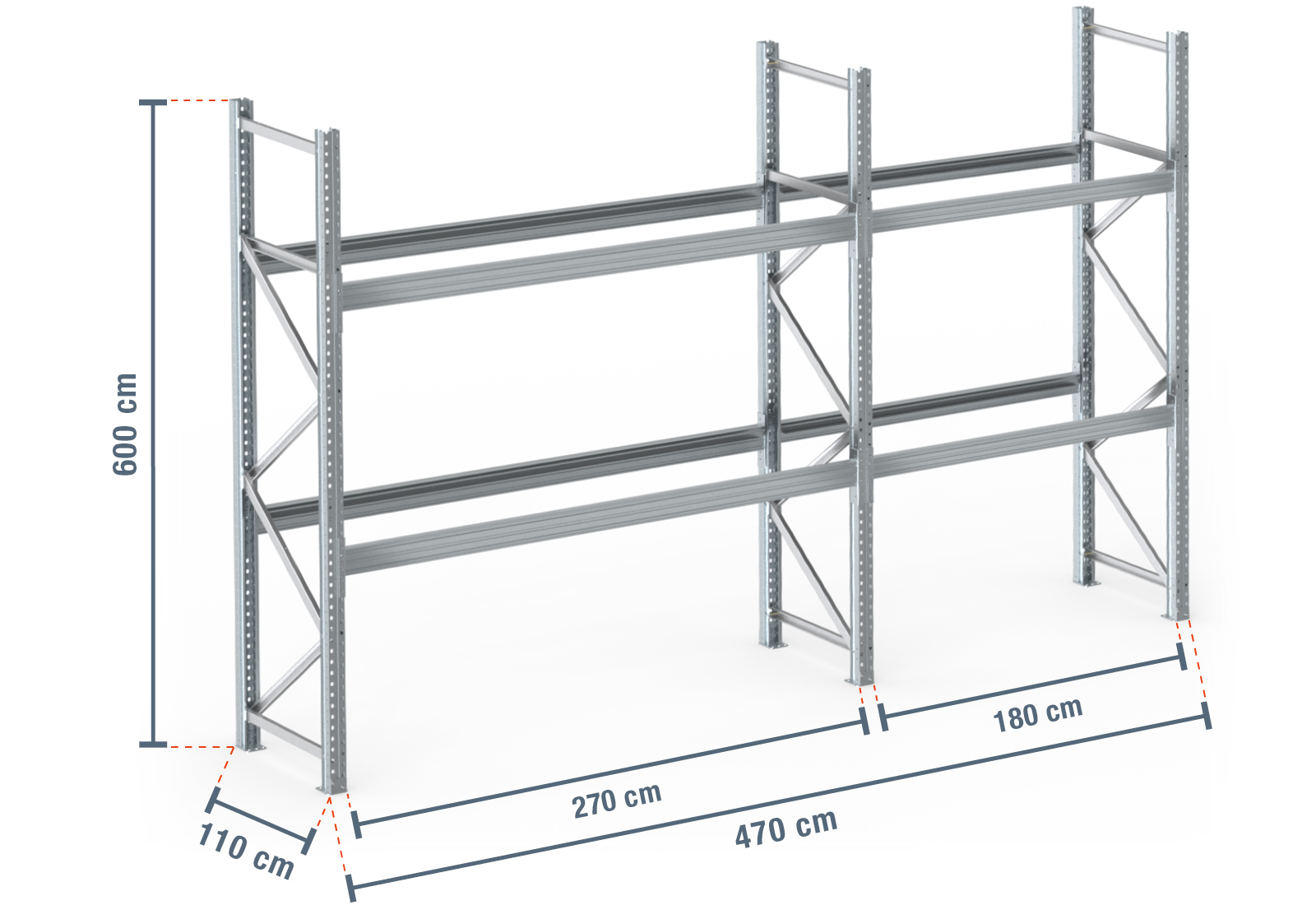 4,7 m pallet rack PR9000F galvanised / 110 cm deep / 6 m high / 2 levels for 15 euro pallets