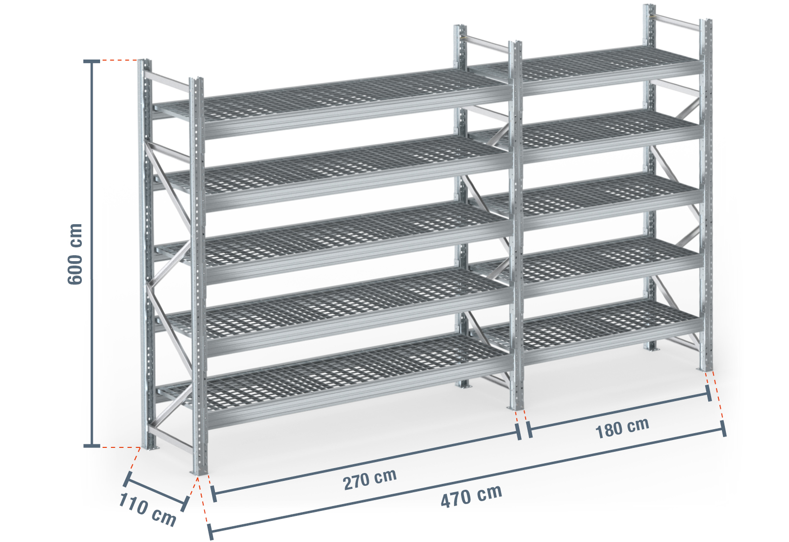 4,7 m pallet rack PR9000F galvanised / 110 cm deep / 6 m high / 5 levels / rack layer Galvanised mesh