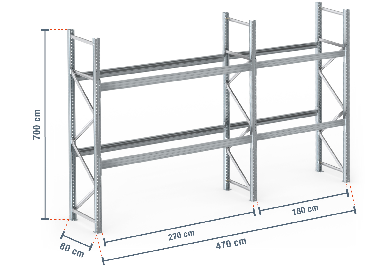4,7 m pallet rack PR9000F galvanised / 80 cm deep / 7 m high / 2 levels for 15 euro pallets