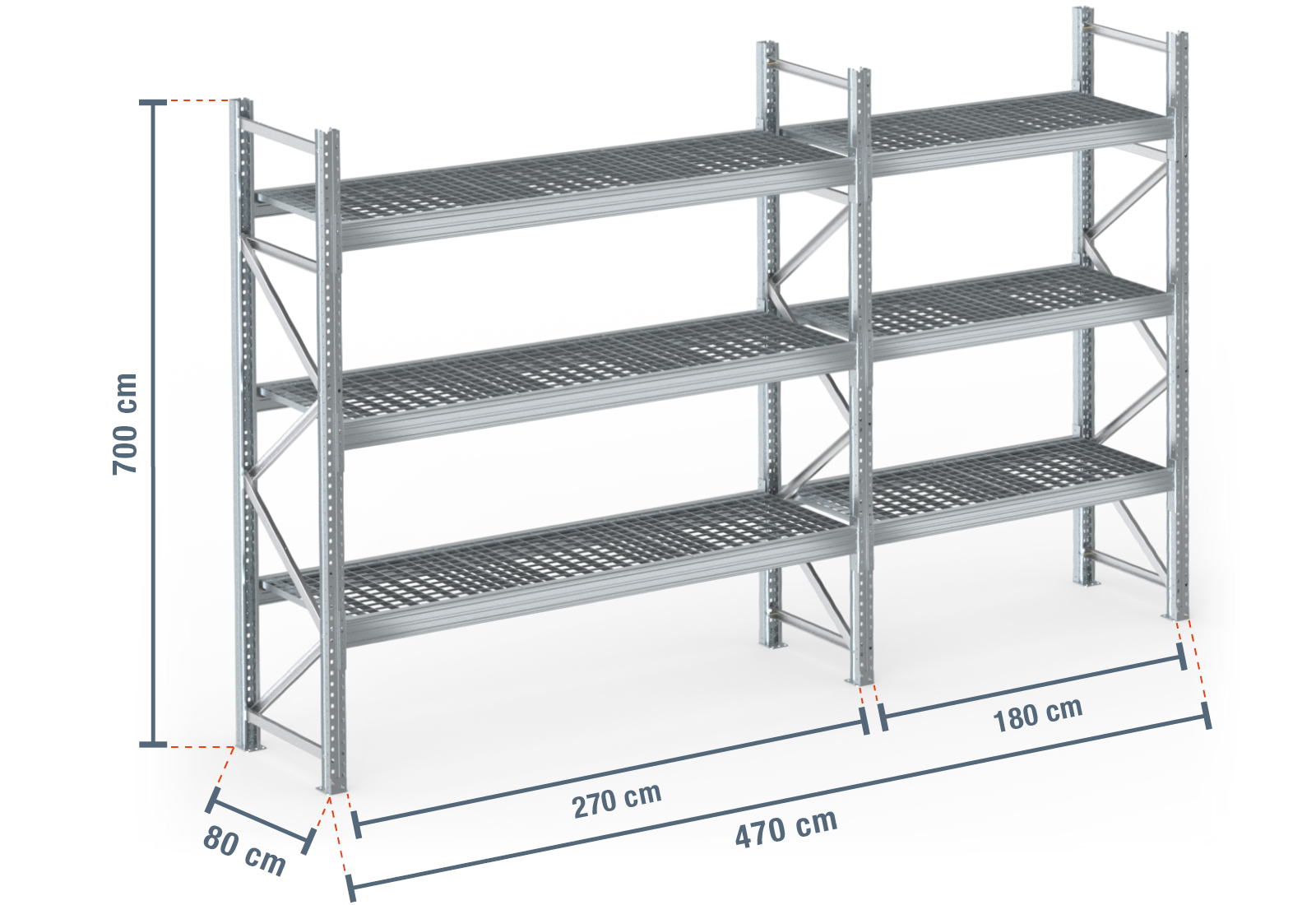 4,7 m pallet rack PR9000F galvanised / 80 cm deep / 7 m high / 3 levels / rack layer Galvanised mesh