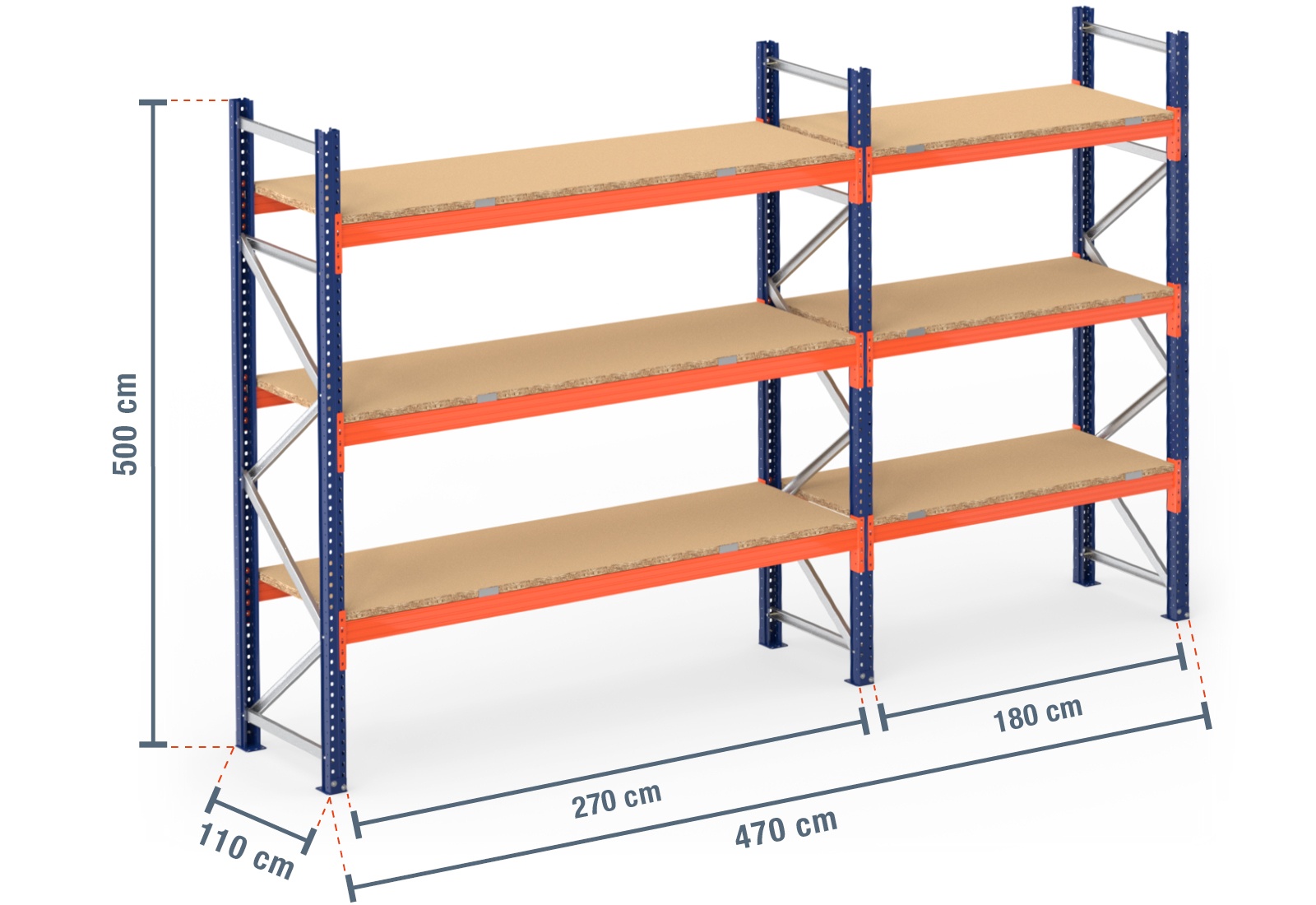 4,7 m pallet racking PR9000 / 110 cm deep / 5 m high / 3 levels / rack layer Wood