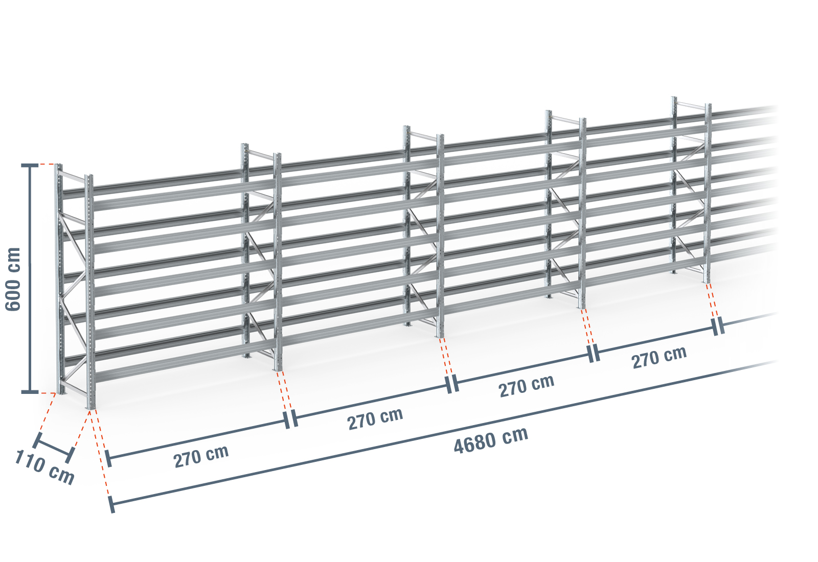 - 18 x upright PR9000F 6 m high / 110 cm deep incl. strutting, unit load capacity: 9.000 kg