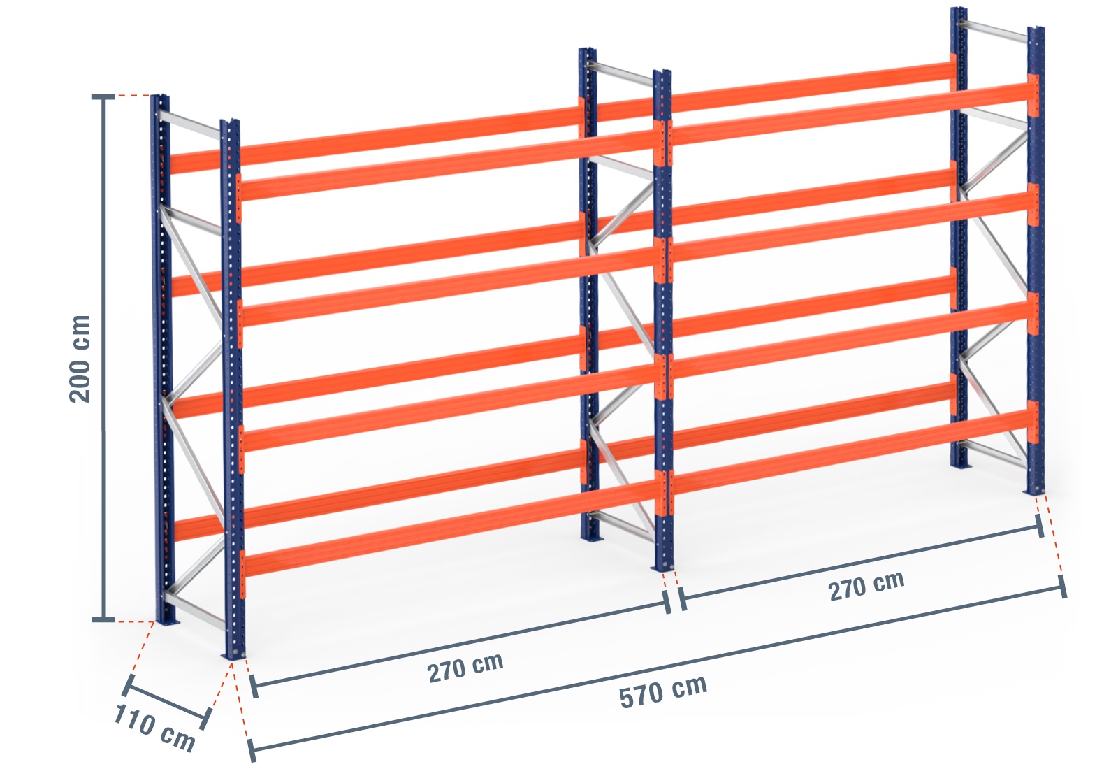 5,7 m pallet rack PR9000 / 110 cm deep / 2 m high / 4 levels for 30 euro pallets