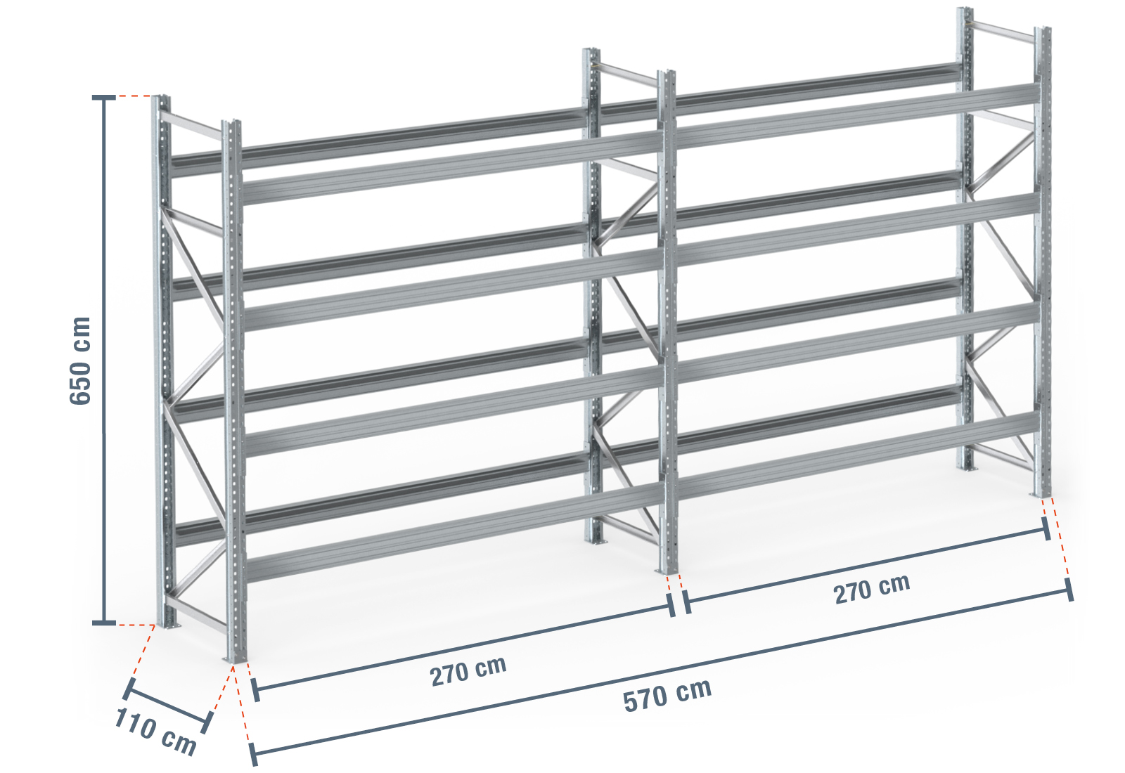5,7 m pallet rack PR9000F galvanised / 110 cm deep / 6,5 m high / 4 levels for 30 euro pallets