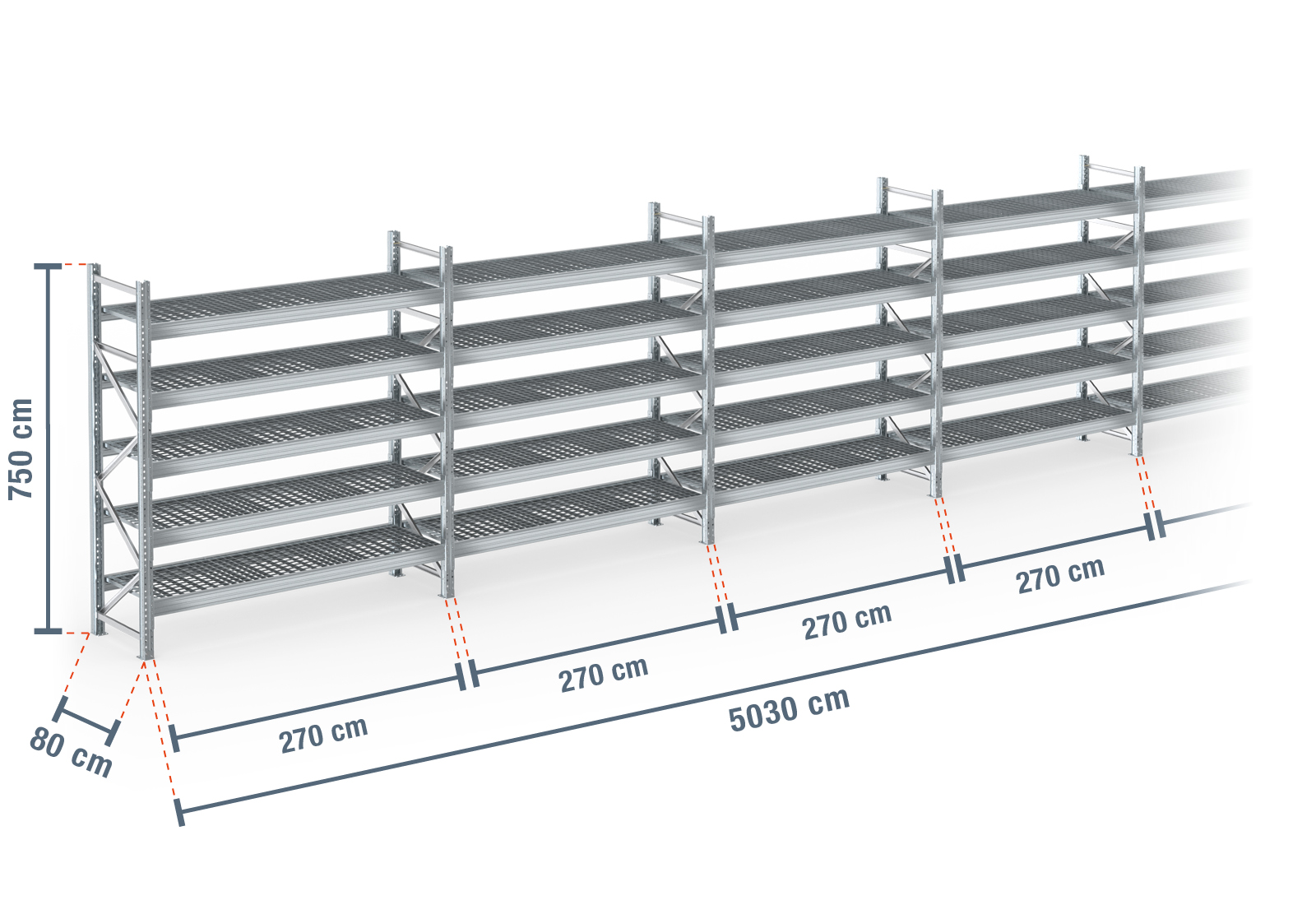 The flexibility of the racking is an extremely interesting feature. The beams can be attached at any height in increments of 50 mm to create different sizes of shelf compartment. Our configurator also allows you to combine different compartment widths and racking heights to meet individual needs. Attachments in the form of additional shelf compartments measuring 180 cm, 270 cm and 360 cm wide or a worktable can be added later. It is also possible to attach additional levels at individual heights.