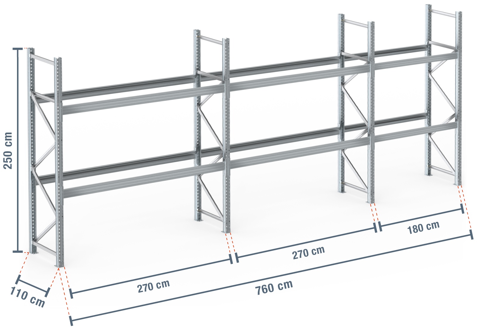 7,6 m pallet rack PR9000F galvanised / 110 cm deep / 2,5 m high / 2 levels for 24 euro pallets