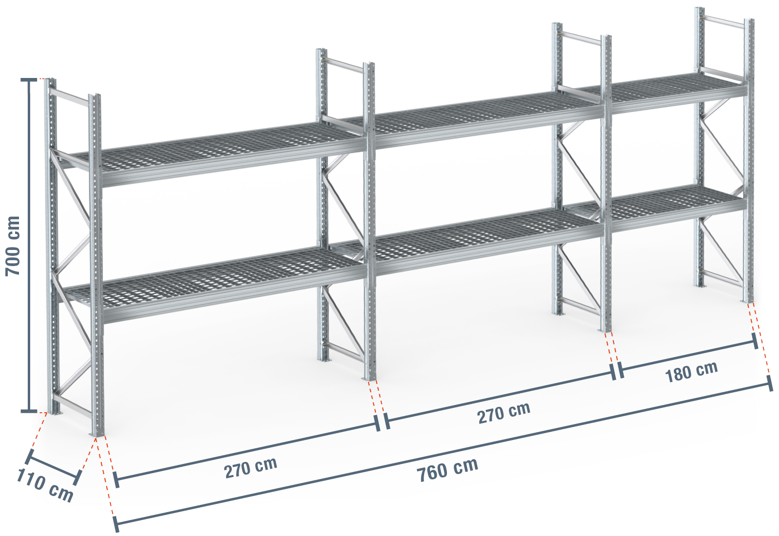 7,6 m pallet rack PR9000F galvanised / 110 cm deep / 7 m high / 2 levels / rack layer Galvanised mesh