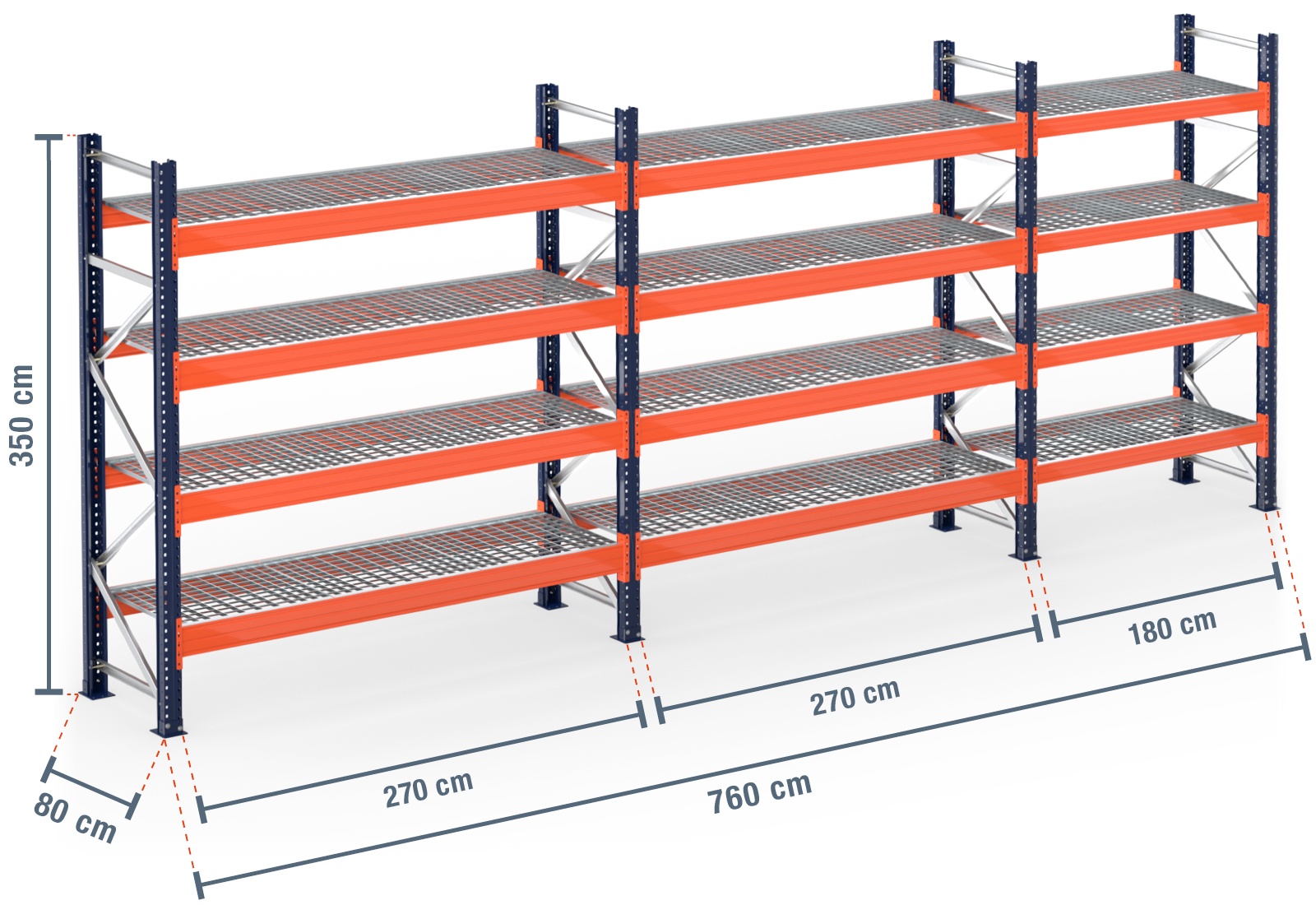 7,6 m pallet racking PR15000 / 80 cm deep / 3,5 m high / 4 levels / rack layer Galvanised mesh