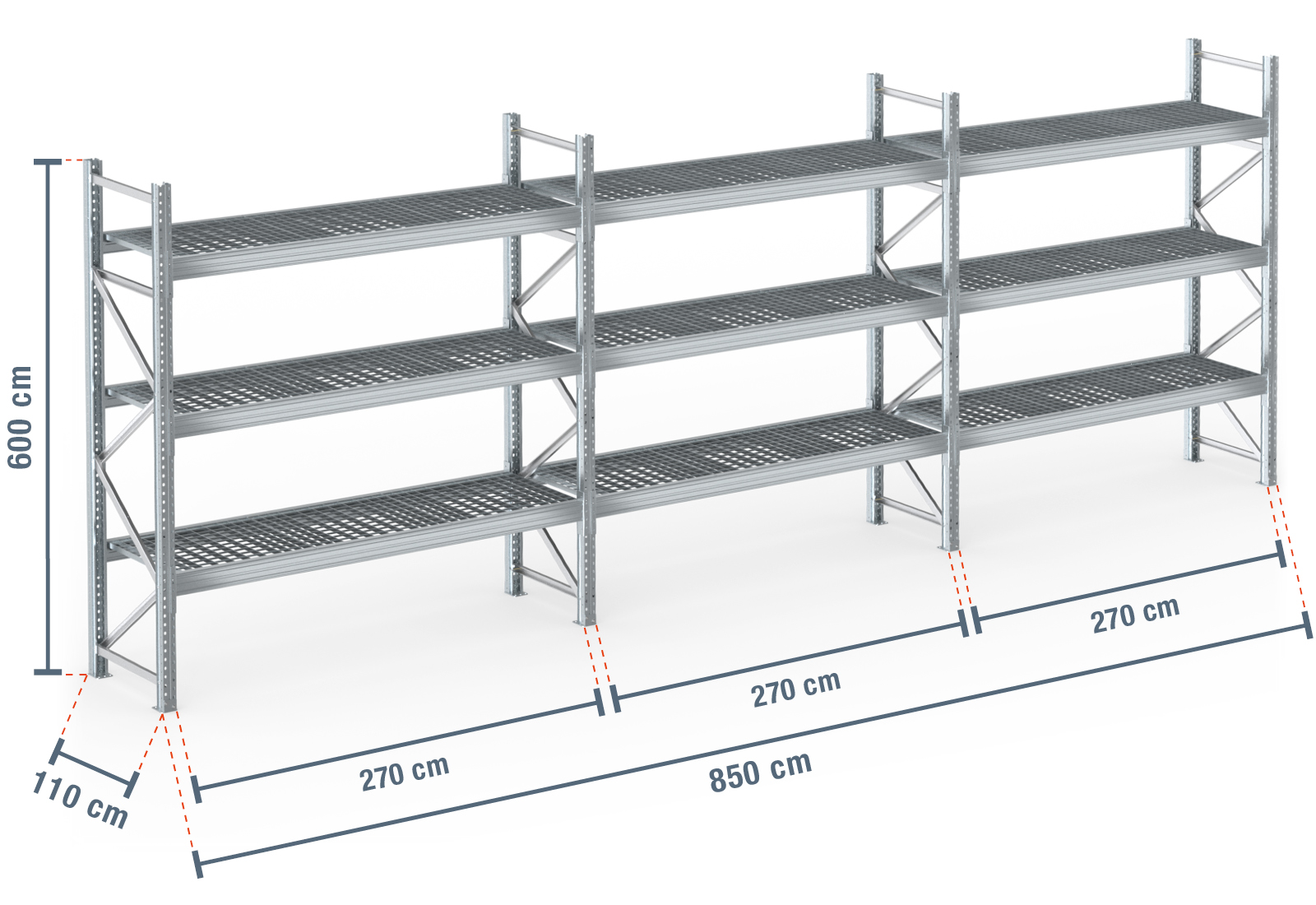8,5 m pallet rack PR9000F galvanised / 110 cm deep / 6 m high / 3 levels / rack layer Galvanised mesh