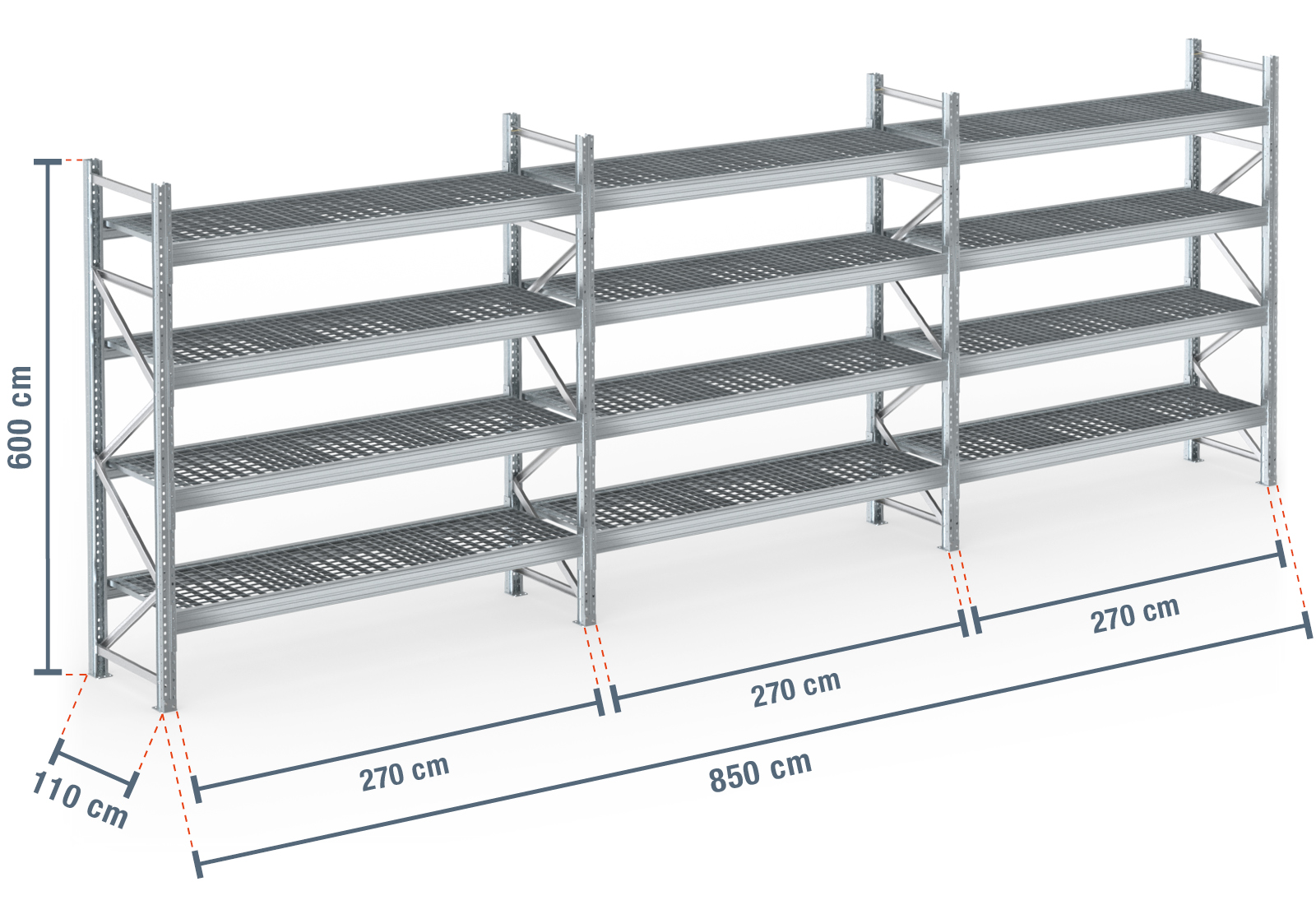 8,5 m pallet rack PR9000F galvanised / 110 cm deep / 6 m high / 4 levels / rack layer Galvanised mesh