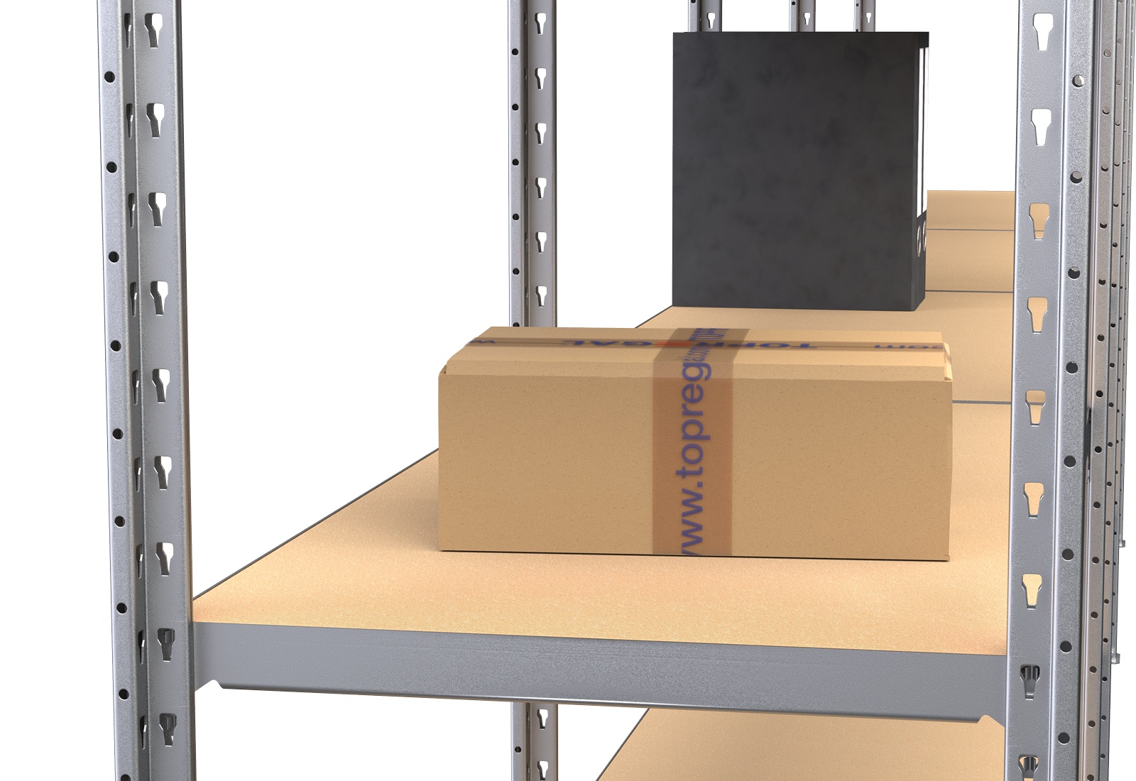 In this rack type, the beams are used to secure the shelves. The integrated kerb makes it easy to insert the shelves. These have a standard length of 100 cm and fit perfectly into the compartments of the shelving rack. This means the rack with its 3 levels is quick and easy to assemble.