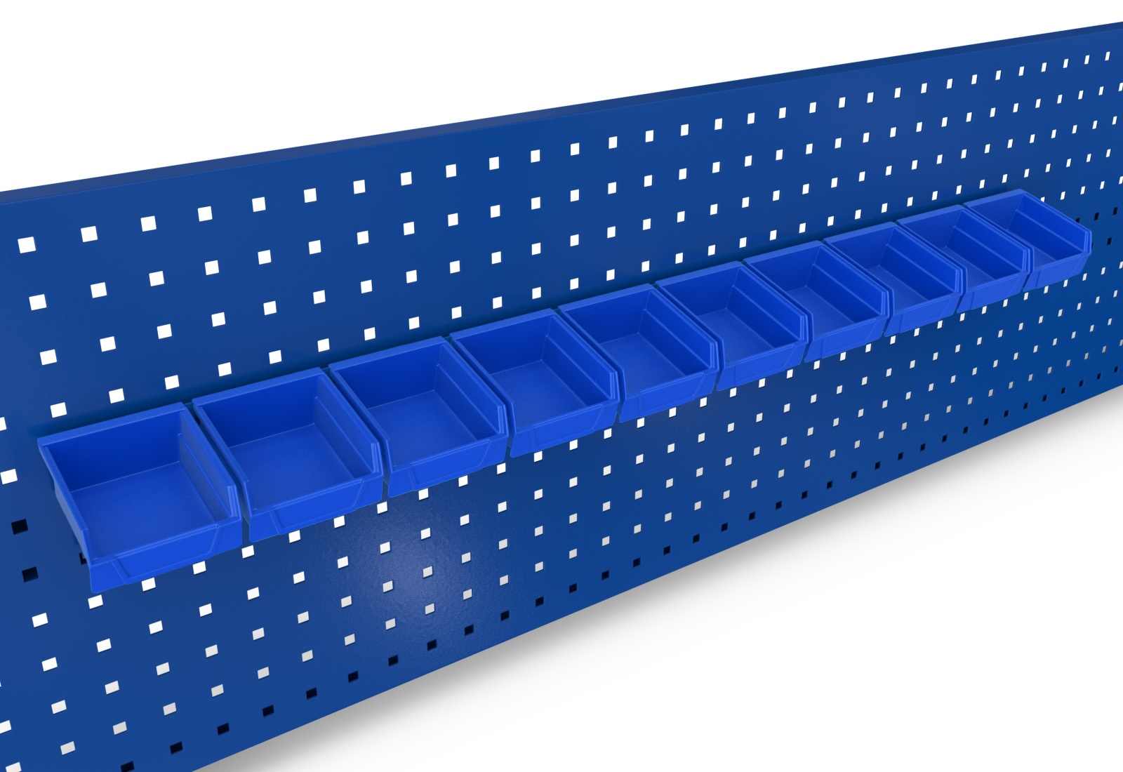 Open fronted storage box set for small parts incl. fixing rail 1.050 mm for perforated back panel