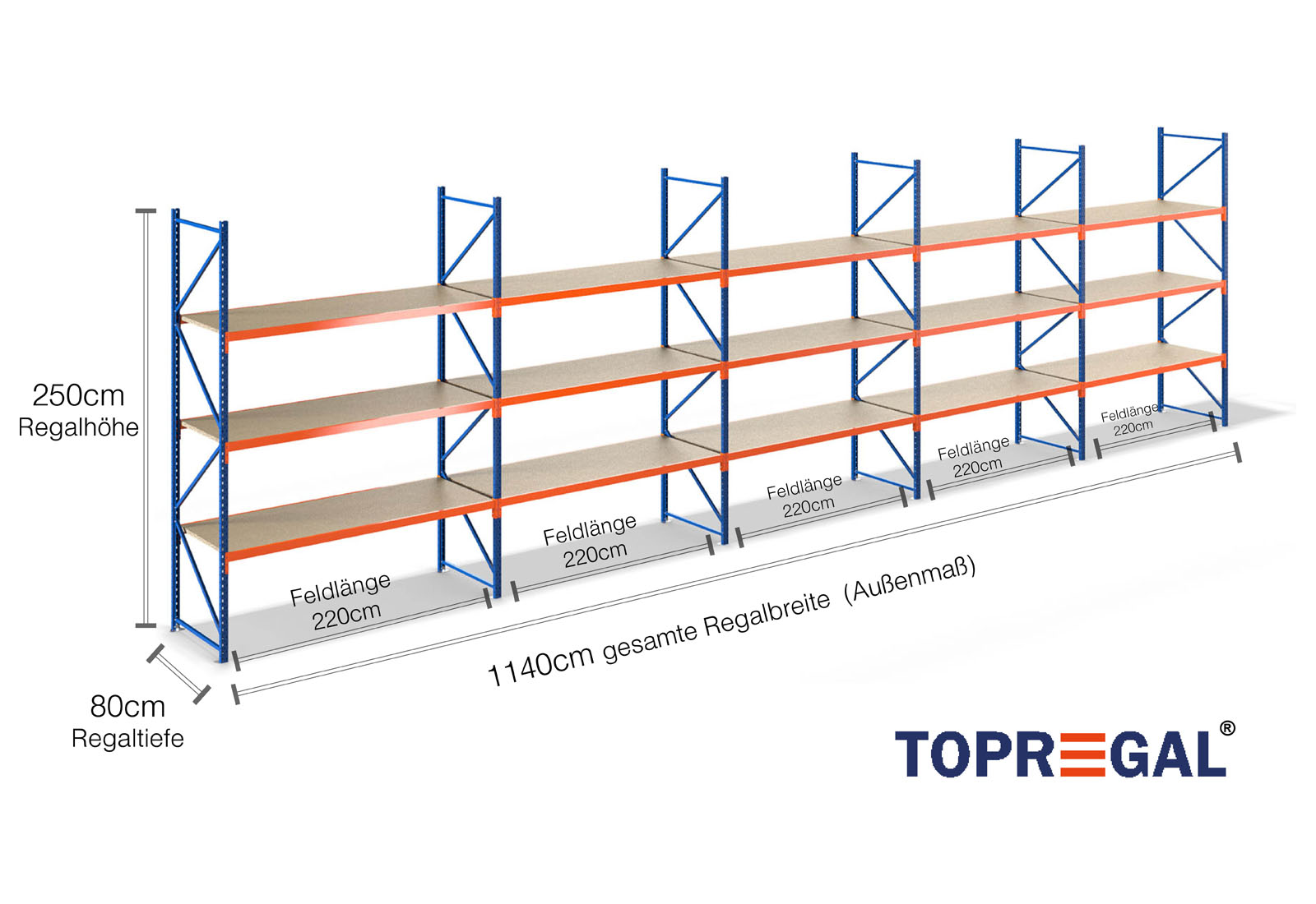 11,4 m storage rack LR2000 / 80 cm deep / 2,5 m high / 3 levels / rack layer Wood