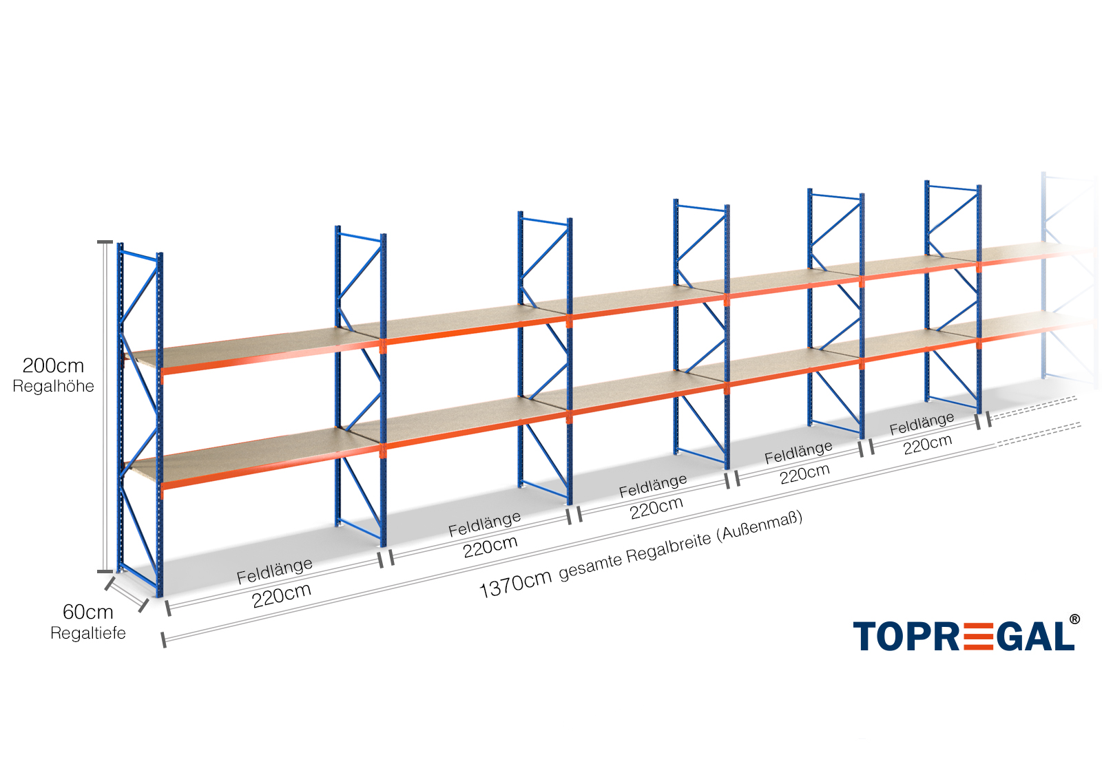 13,7 m storage rack LR2000 / 60 cm deep / 2 m high / 2 levels / rack layer Wood
