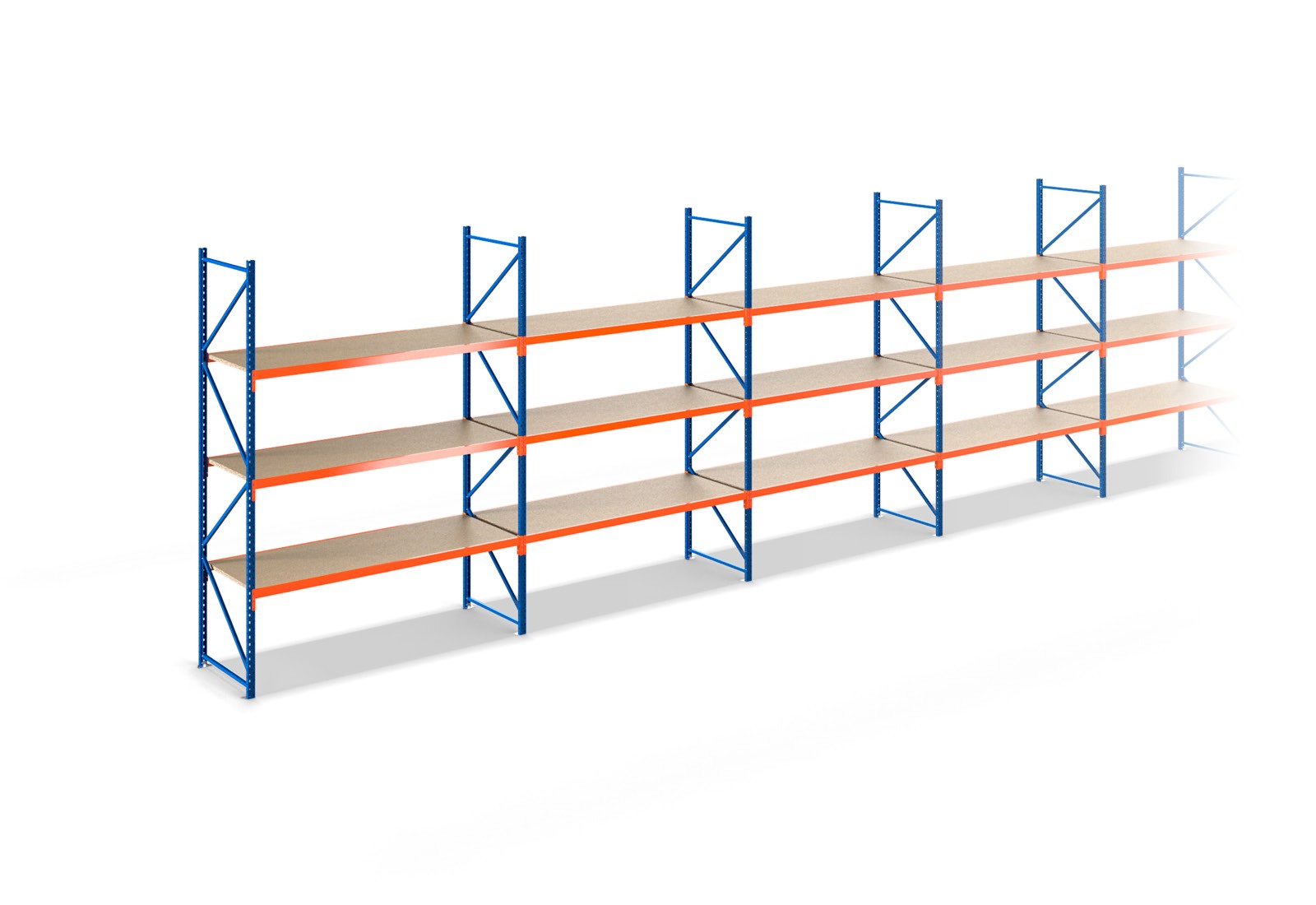 Assembly is complete in just a few steps. Thanks to the simple plug-in system, you can attach the beams individually in increments of 50 mm and secure them with safety pins. The modular system of our storage racks ensures that your rack can be widened at any time or expanded to include more levels. This racking type features an attractive appearance, with orange beams and blue storage rack uprights, as well as a robust and durable design.
