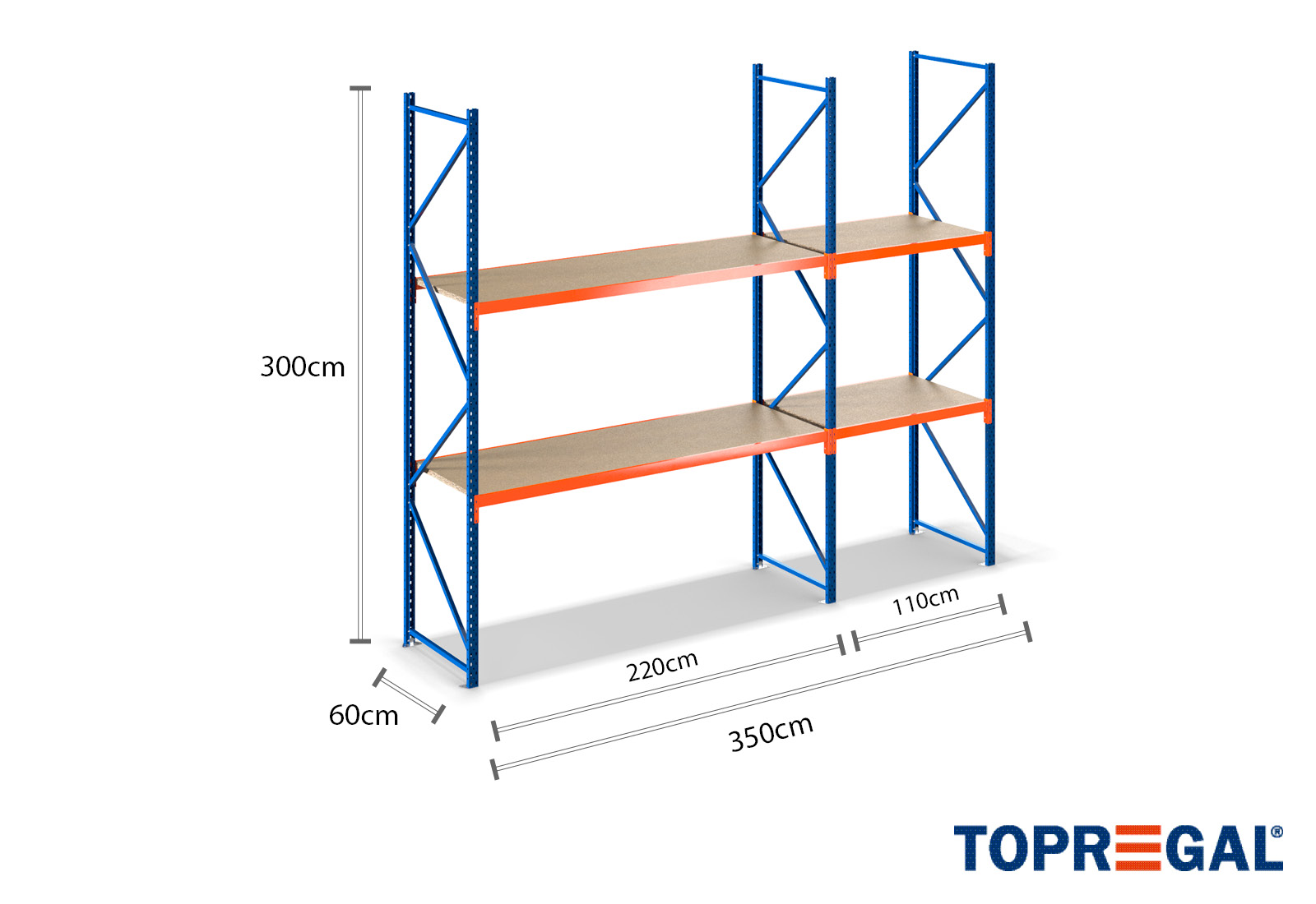 3,5 m storage rack LR2000 / 60 cm deep / 3 m high / 2 levels / rack layer Wood