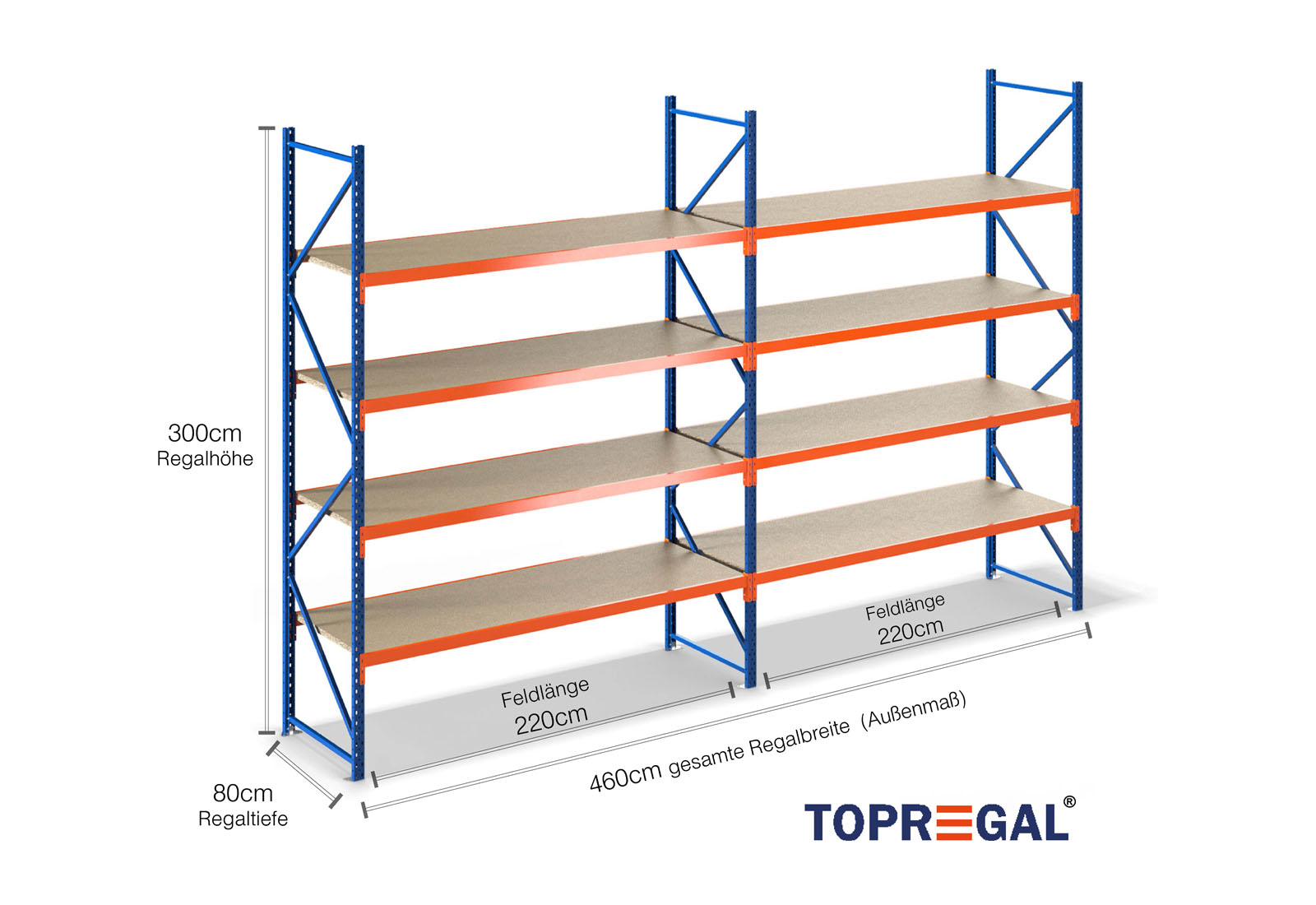 4,6 m storage rack LR2000 / 80 cm deep / 3 m high / 4 levels / rack layer Wood